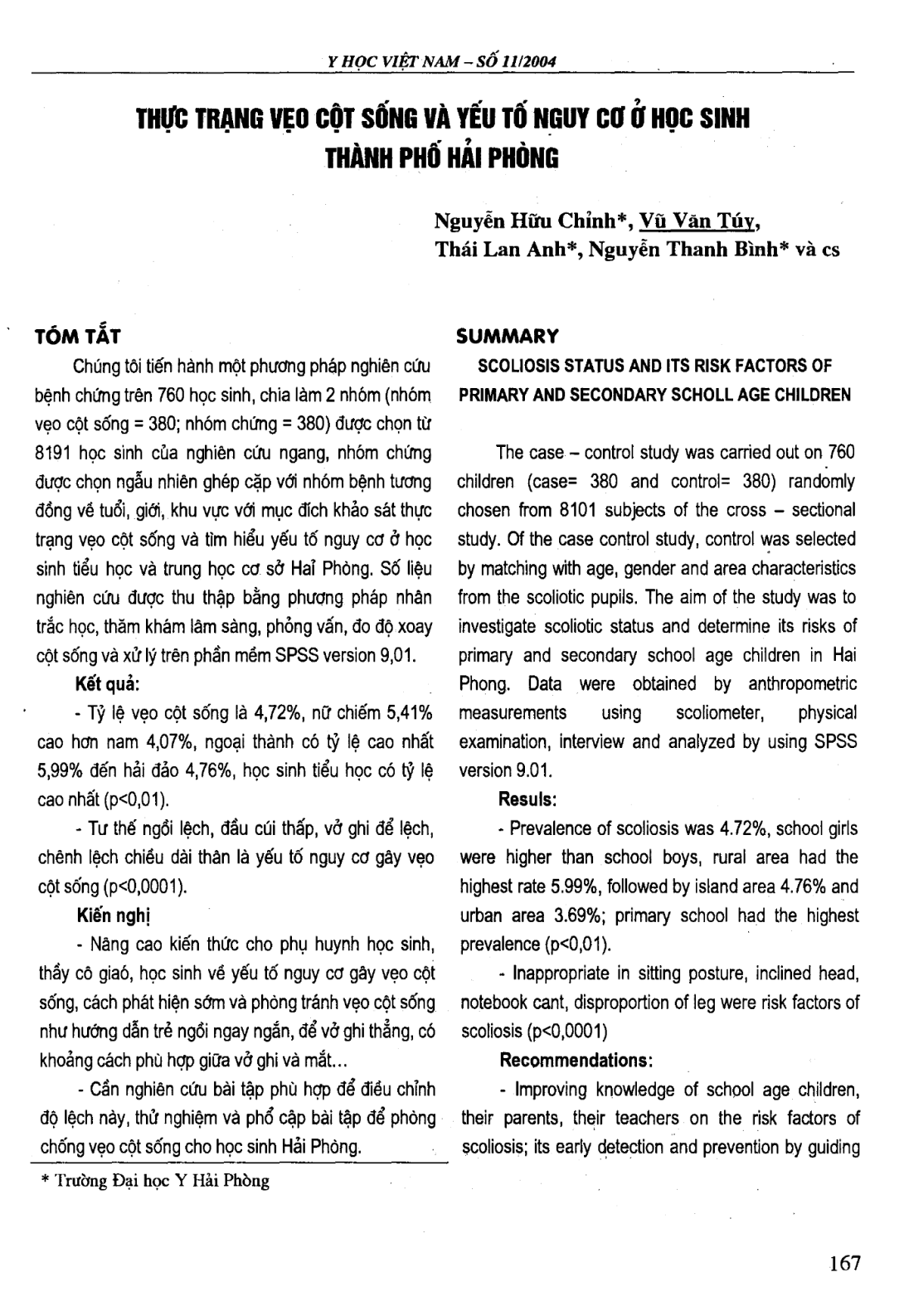 Nghiên cứu được tiến hành trên 8101 học sinh phổ thông tại Hải Phòng. Tỷ lệ vẹo cột sống (VCS) là 4,72% , học sinh nữ chiếm tỷ lệ cao hơn nam. 45,5% học sinh có VCS kiểu chữ C thuận và 37,2% kiểu chữ C nghịch. Khoảng 96% học sinh VCS có độ xoay cột sống 6o, nam có độ xoay cột sống lớn hơn nữ. Một số yếu tố nguy cơ gây cong VCS: tư thế ngồi lệch, đầu cúi thấp, vở ghi để lệch, chênh lệch chiều dài chân. Đề xuất một số giải pháp giảm tỷ lệ cong VCS học sinh: nâng cao kiến thức cho học sinh, cha mẹ học sinh và thầy cô giáo về các yếu tố nguy cơ gây cong VCS; có những bài tập thể dục phù hợp để phục hồi cho trẻ bị cong VCS.