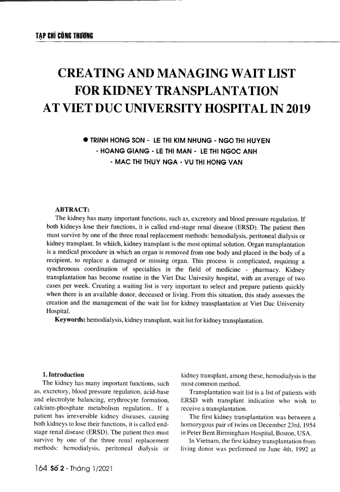 The kidney has many important functions, such as excretion and blood pressure regulation. If both kidneys lose their functions, it is called end-stage renal disease (ERSD). The patient then must survive by one of the three renal replacement methods: hemodialysis, peritoneal dialysis or kidney transplant. In which, kidney transplant is the most optimal solution. Organ transplantation is a medical procedure in which an organ is removed from one body and placed in the body of a recipient, to replace a damaged or missing organ. This process is complicated, requiring a synchronous coordination of specialties in the field of medicine - pharmacy. Kidney transplantation has become routine in the Viet Duke University hospital, with an average of two cases per week. Creating a waiting list is very important to select and prepare patients quickly when there is an available donor, deceased or living. From this situation, this study assesses the creation and the management of the waitlist for kidney transplantation at Viet Due University Hospital.