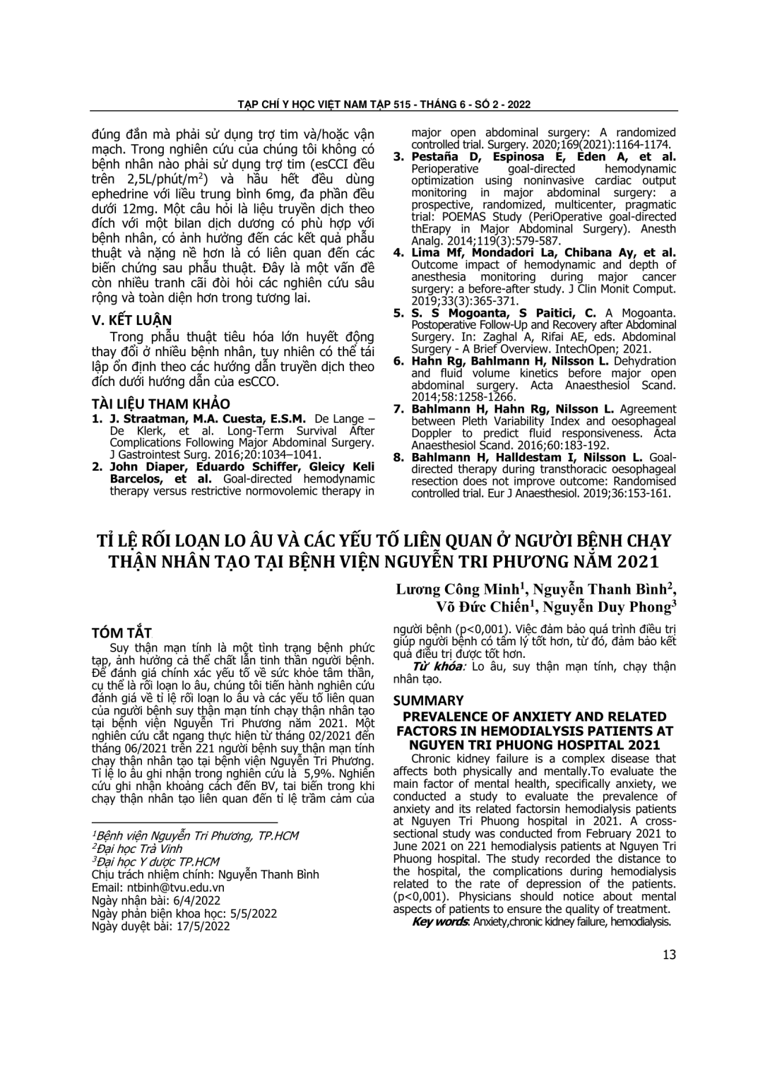 Suy thận mạn tính là một tình trạng bệnh phức tạp, ảnh hưởng cả thể chất lẫn tinh thần người bệnh. Để đánh giá chính xác yếu tố về sức khỏe tâm thần, cụ thể là rối loạn lo âu, chúng tôi tiến hành nghiên cứu đánh giá về tỉ lệ rối loạn lo âu và các yếu tố liên quan của người bệnh suy thận mạn tính chạy thận nhân tạo tại bệnh viện Nguyễn Tri Phương năm 2021. Một nghiên cứu cắt ngang thực hiện từ tháng 02/2021 đến tháng 06/2021 trên 221 người bệnh suy thận mạn tính chạy thận nhân tạo tại bệnh viện Nguyễn Tri Phương. Tỉ lệ lo âu ghi nhận trong nghiên cứu là 5,9%. Nghiên cứu ghi nhận khoảng cách đến BV, tai biến trong khi chạy thận nhân tạo liên quan đến tỉ lệ trầm cảm của người bệnh (p<0,001). Việc đảm bảo quá trình điều trị giúp người bệnh có tâm lý tốt hơn, từ đó, đảm bảo kết quả điều trị được tốt hơn.