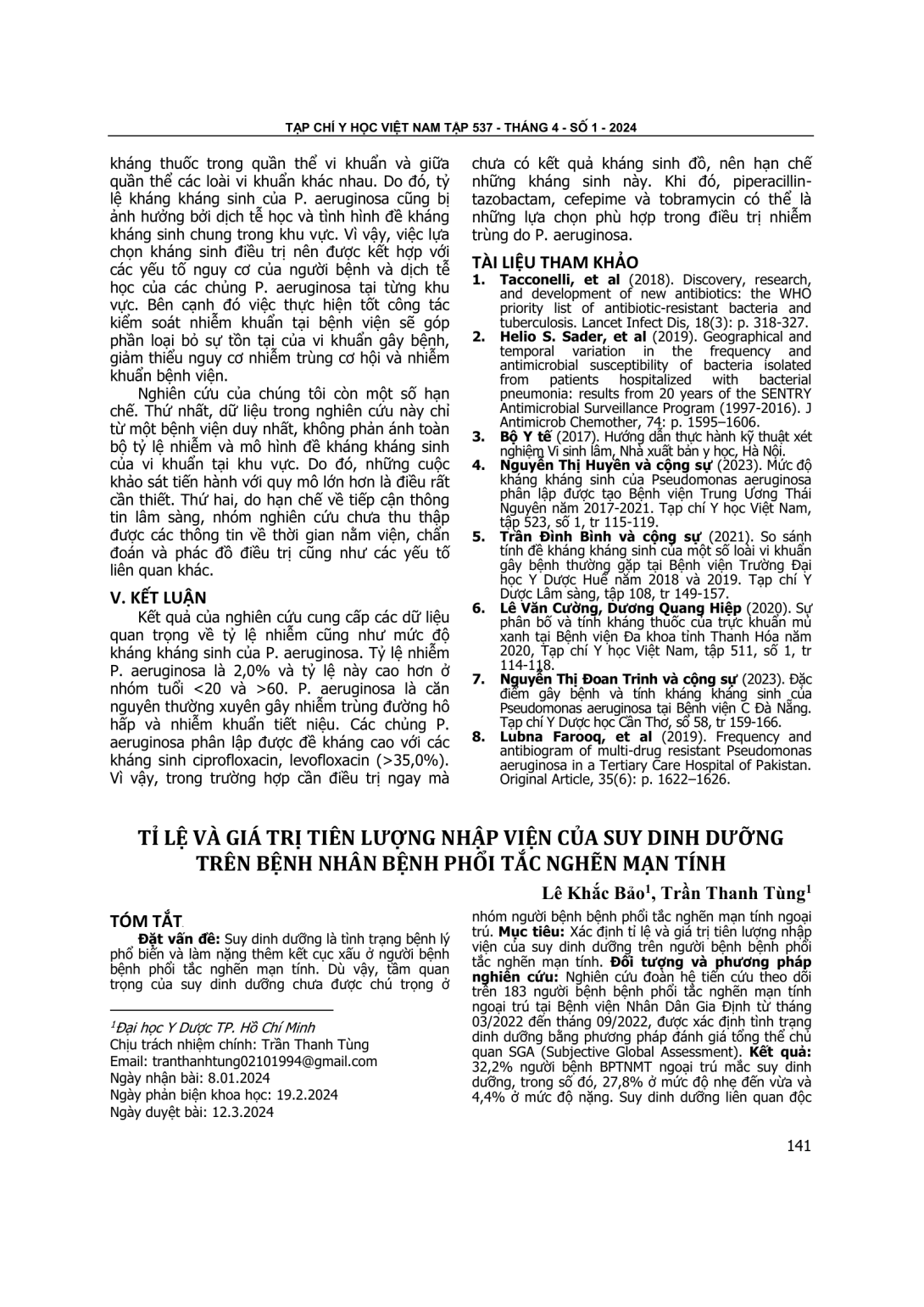 Suy dinh dưỡng là tình trạng bệnh lý phổ biến và làm nặng thêm kết cục xấu ở người bệnh bệnh phổi tắc nghẽn mạn tính. Dù vậy, tầm quan trọng của suy dinh dưỡng chưa được chú trọng ở nhóm người bệnh bệnh phổi tắc nghẽn mạn tính ngoại trú. Mục tiêu: Xác định tỉ lệ và giá trị tiên lượng nhập viện của suy dinh dưỡng trên người bệnh bệnh phổi tắc nghẽn mạn tính. Đối tượng và phương pháp nghiên cứu: Nghiên cứu đoàn hệ tiến cứu theo dõi trên 183 người bệnh bệnh phổi tắc nghẽn mạn tính ngoại trú tại Bệnh viện Nhân Dân Gia Định từ tháng 03/2022 đến tháng 09/2022, được xác định tình trạng dinh dưỡng bằng phương pháp đánh giá tổng thể chủ quan SGA (Subjective Global Assessment). Kết quả: 32,2% người bệnh BPTNMT ngoại trú mắc suy dinh dưỡng, trong số đó, 27,8% ở mức độ nhẹ đến vừa và 4,4% ở mức độ nặng. Suy dinh dưỡng liên quan độc lập nhập viện do mọi nguyên nhân với OR = 2,45; (KTC 95% = 1,02 - 5,89; p = 0,045).