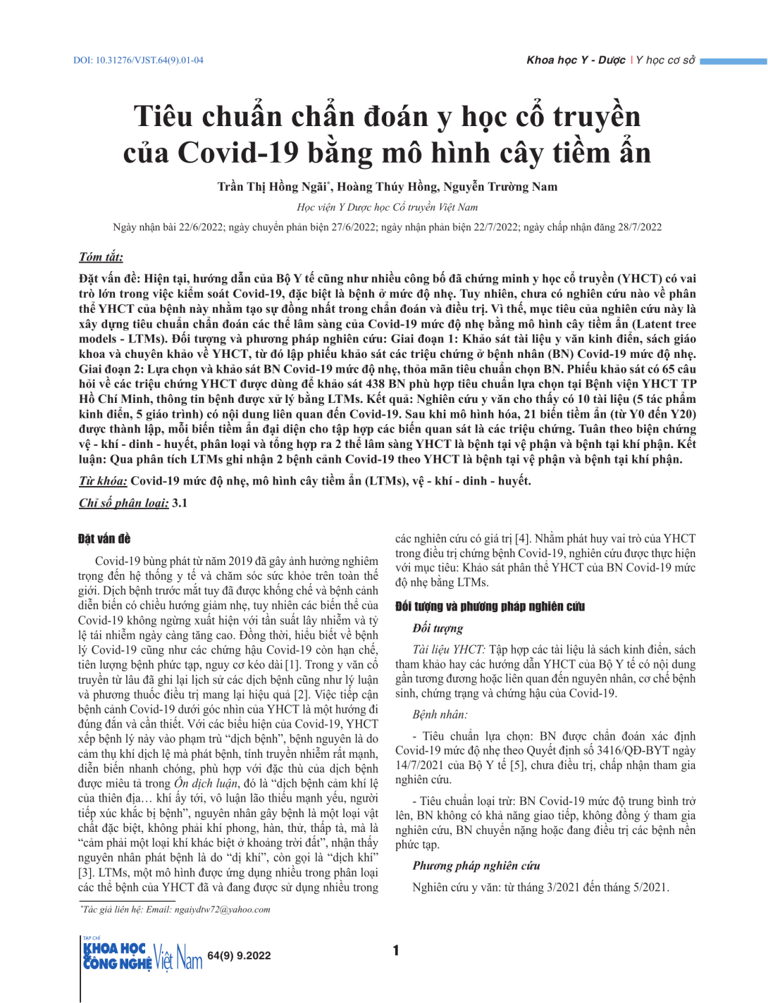 Hiện tại, hướng dẫn của Bộ Y tế cũng như nhiều công bố đã chứng minh y học cổ truyền (YHCT) có vai trò lớn trong việc kiểm soát Covid-19, đặc biệt là bệnh ở mức độ nhẹ. Tuy nhiên, chưa có nghiên cứu nào về phân thể YHCT của bệnh này nhằm tạo sự đồng nhất trong chẩn đoán và điều trị. Vì thế, mục tiêu của nghiên cứu này là xây dựng tiêu chuẩn chẩn đoán các thể lâm sàng của Covid-19 mức độ nhẹ bằng mô hình cây tiềm ẩn (Latent tree models - LTMs). Khảo sát tài liệu y văn kinh điển, sách giáo khoa và chuyên khảo về YHCT, từ đó lập phiếu khảo sát các triệu chứng ở bệnh nhân (BN) Covid-19 mức độ nhẹ. Giai đoạn 2: Lựa chọn và khảo sát BN Covid-19 mức độ nhẹ, thỏa mãn tiêu chuẩn chọn BN. Phiếu khảo sát có 65 câu hỏi về các triệu chứng YHCT được dùng để khảo sát 438 BN phù hợp tiêu chuẩn lựa chọn tại Bệnh viện YHCT TP Hồ Chí Minh, thông tin bệnh được xử lý bằng LTMs. Nghiên cứu y văn cho thấy có 10 tài liệu (5 tác phẩm kinh điển, 5 giáo trình) có nội dung liên quan đến Covid-19. Sau khi mô hình hóa, 21 biến tiềm ẩn (từ Y0 đến Y20) được thành lập, mỗi biến tiềm ẩn đại diện cho tập hợp các biến quan sát là các triệu chứng. Tuân theo biện chứng vệ - khí - dinh - huyết, phân loại và tổng hợp ra 2 thể lâm sàng YHCT là bệnh tại vệ phận và bệnh tại khí phận. Qua phân tích LTMs ghi nhận 2 bệnh cảnh Covid-19 theo YHCT là bệnh tại vệ phận và bệnh tại khí phận.