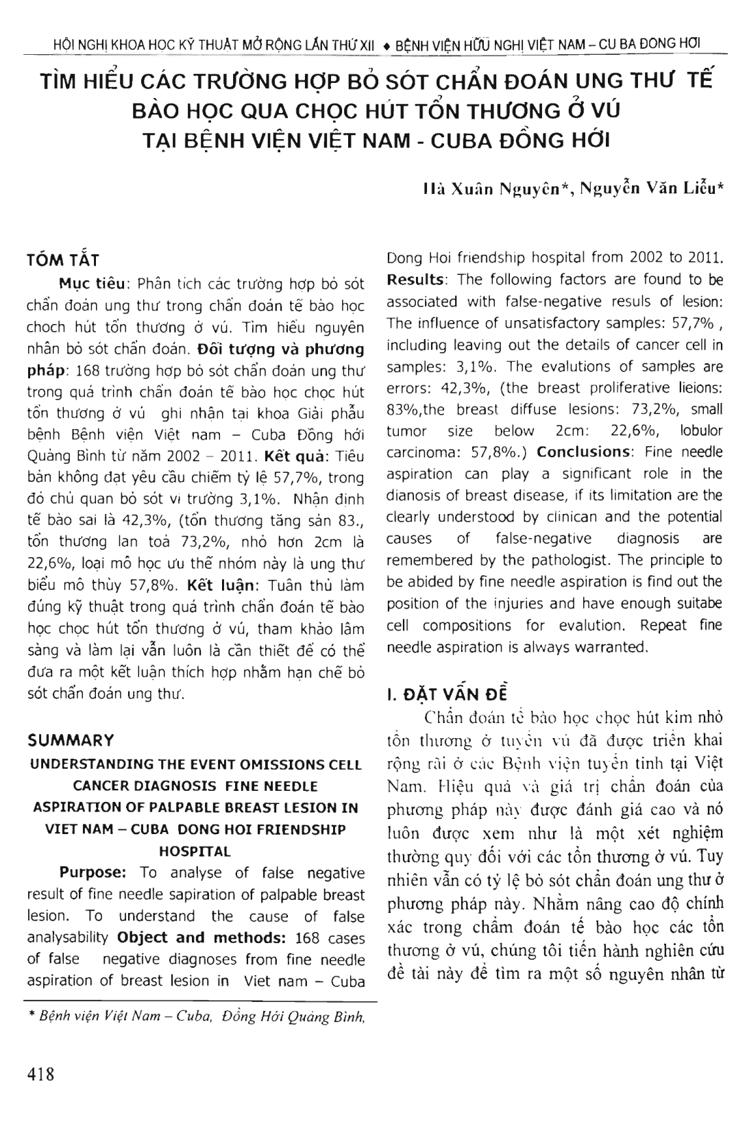 Purpose: To analyse of false negative result of fine needle sapiration of palpable breast lesion. To understand the cause of false analysability. Object and methods: 168 cases of false - negative diagnoses from fine needle aspiration of breast lesion in Vietnam-Cuba Dong Hoi friendship hospital from 2002 to 2011. Results: The following factors are found to be associated with false-negative resuls of lesion: The influence of unsatisfactory samples: 57.7 percent , including leaving out the details of cancer cell in samples: 3.1 percent. The evalutions of samples are errors: 42.3 percent, (the breast proliferative lielons: 83 percent, the breast diffuse lesions: 73.2 percent, small tumor size below 2cm: 22.6 percent, lobulor carcinoma: 57.8 percent). Conclusions: Fine needle aspiration can play a significant role in the dianosis of breast disease, if its limitation are the clearly understood by clinican and the potential causes of false-negative diagnosis are remembered by the pathologist. The principle to be abided by fine needle aspiration is find out the position of the injuries and have enough suitabe cell compositions for evalution. Repeat fine needle aspiration is always warranted.