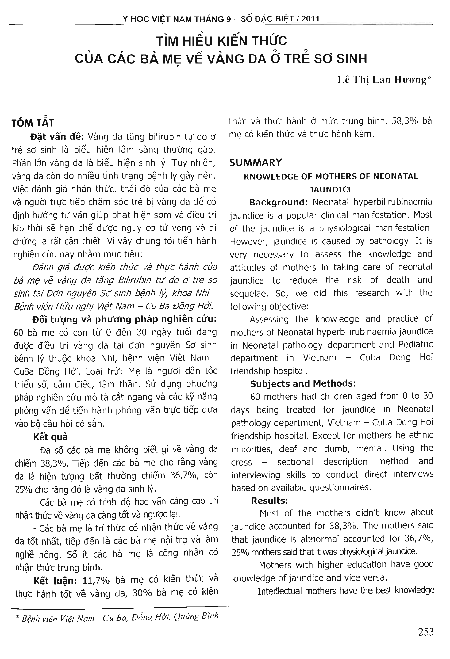 Background: Neonatal hyperbilirubinaemia jaundice is a popular clinical manifestation. Most of the jaundice is a physiological manifestation. However, jaundice is caused by pathology. It is very necessary to assess the knowledge and attitudes of mothers in taking care of neonatal jaundice to reduce the risk of death and sequelae. So, the authors conducted this research with the following objective: Assessing the knowledge and practice of mothers of Neonatal hyperbilirubinaemia jaundice in Neonatal pathology department and Pediatric department in Vietnam-Cuba Dong Hoi friendship hospital. Subjects and Methods: 60 mothers had children aged from 0 to 30 days being treated for jaundice in Neonatal pathology department, Vietnam-Cuba Dong Hoi friendship hospital. Except for mothers be ethnic minorities, deaf and dumb, mental. Using the cross-sectional description method and interviewing skills to conduct direct interviews based on available questionnaires. Results: - Most of the mothers didn't know about jaundice accounted for 38.3 percent. The mothers said that jaundice is abnormal accounted for 36.7 percent, 25 percent mothers said that it was physiological jaundice; - Mothers with higher education have good a knowledge of jaundice and vice versa; - Interilectual mothers have the best knowledge of jaundice, followed by housewives and farmers. Small number of workers has the average knowledge.