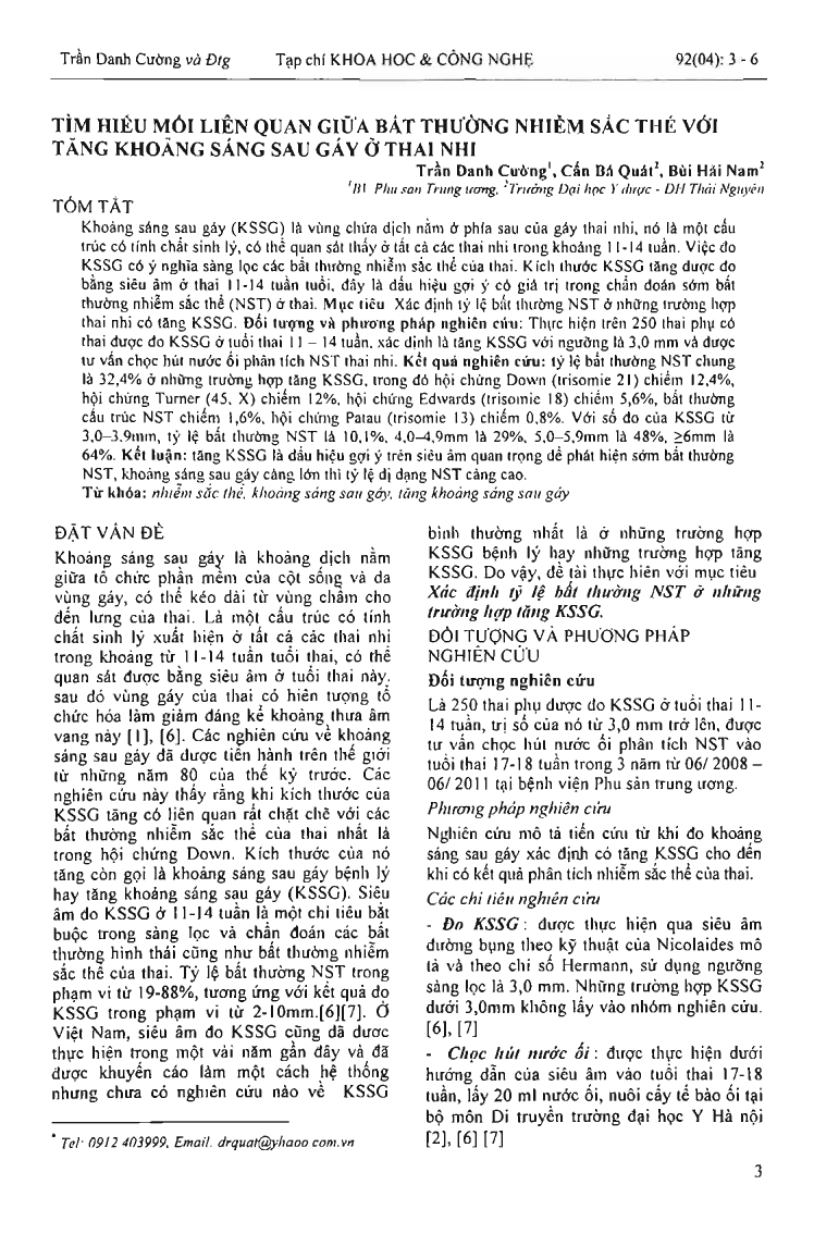 Nuchal translucency (NT) is the amount of fluid behind fetus's neck. NT is a physiological feature of the fetus and can be measured from 11-14 week of gestation age. NT play an important part in screening chromosomal disorders. Increase of NT between 11 to 14 week is considered a suggestive signs of chromosomal disorders of the fetus. Objectives: to evaluate the rate of chromosomal disorder of the fetuses with increase of NT. Materials and methods: we measured NT of 250 pregnant women in 11-14 week of gestation. Above 3.0 mm considered not normal. Results: the rate of chromosomal disorder is 32.4 percent in those cases of increase of NT among those trisomy 21 is 12.4 percent, monosomy X is 12 percent, trisomy 18 is 5.6 percent, trisomy 13 is 0.8 percent and stutural disorder is 1.6 percent. With the range from 3.0 to 3.9 mm, the rate of chromosomal disorder is 10.1 percent, 4.0 to 4.9 mm is 29 percent, 5.0 to 5.9 mm is 48 percent and above 6 mm is 64 percent. Conclusion: increase of NT is a suggestive signs of chromosomal disorder. The thicker NT is, the higher risk of chromosomal disorder.