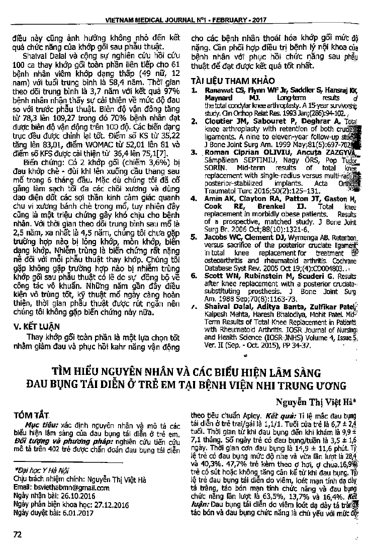 Tìm hiểu nguyên nhân và các biểu hiện lâm sàng đau bụng tái diễn trên 402 trẻ em tại bệnh viện Nhi Trung ương theo tiêu chuẩn Apley. Tỷ lệ mắc đau bụng tái diễn ở trẻ trai/gái là 1,1/1. Thời gia ntwf khi đau bụng đến khi khám là 9,9 cộng trừ 7,1 tháng. Thời gian cơn đau bụng là 14,9 cộng trừ 11,6 phút. Tỷ lệ trẻ có đau bụng mức độ nhẹ và vừa lần lượt là 28,4 và 40,3 phần trăm. 47,7 phần trăm trẻ có kèm theo ợ hơi, ợ chua. 16,9 phần trăm trẻ có sút hoặc không tăng cân kể từ khi đau bụng. Tỷ lệ trẻ đau bụng tái diễn do viêm. loét mạn tính dạ dày tá tràng, táo bón mạn tính chức năng và đau bụng chức năng lần lượt là 63,5 phần trăm; 13,7 phần trăm và 16,4 phần trăm.