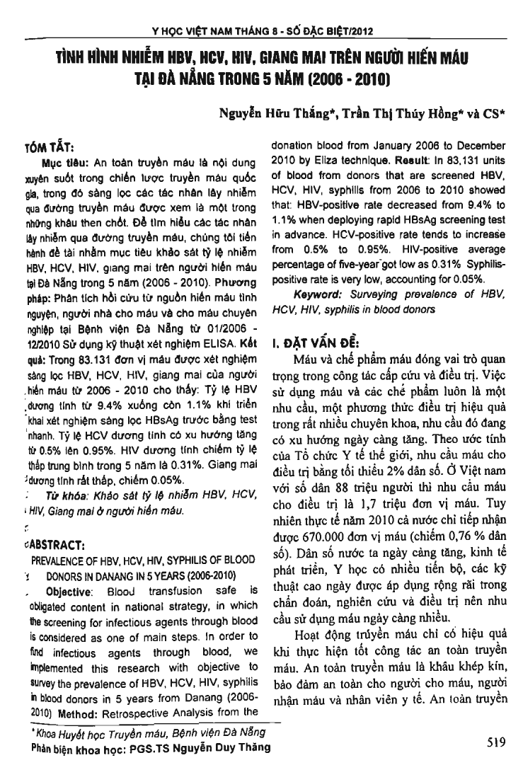 Objective: Blood transfusion safe is obligated content in national strategy, in which the screening for infectious agents through blood is considered as one of main steps. In order to find infectious agents through blood, the authors implemented this research with objective to survey the prevalence of HBV, HCV, HIV, syphilis in blood donors in 5 years (20062010) in Danang city. Method: Retrospective Analysis from the donation blood from January 2006 to December 2010 by Eliza technique. Result: In 83.131 units of blood from donors that are screened HBV, HCV, HIV, syphilis from 2006 to 2010 showed that: HBV-positive rate decreased from 9.4 percent to 1.1 percent when deploying rapid HBsAg screening test in advance. HCV-positive rate tends to increase from 0.5 percent to 0.95 percent. HIV-positive average percentage of five-years got low as 0.31 percent. Syphilispositive rate is very low, accounting for 0.05 percent.