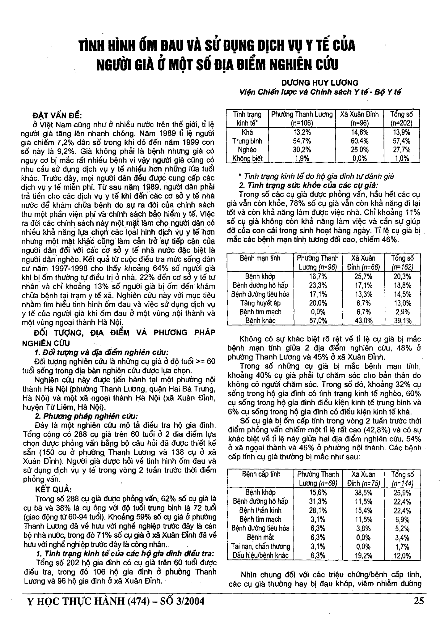 Tình hình ốm đau và sử dụng dịch vụ y tế của người già ở một số địa điểm nghiên cứu