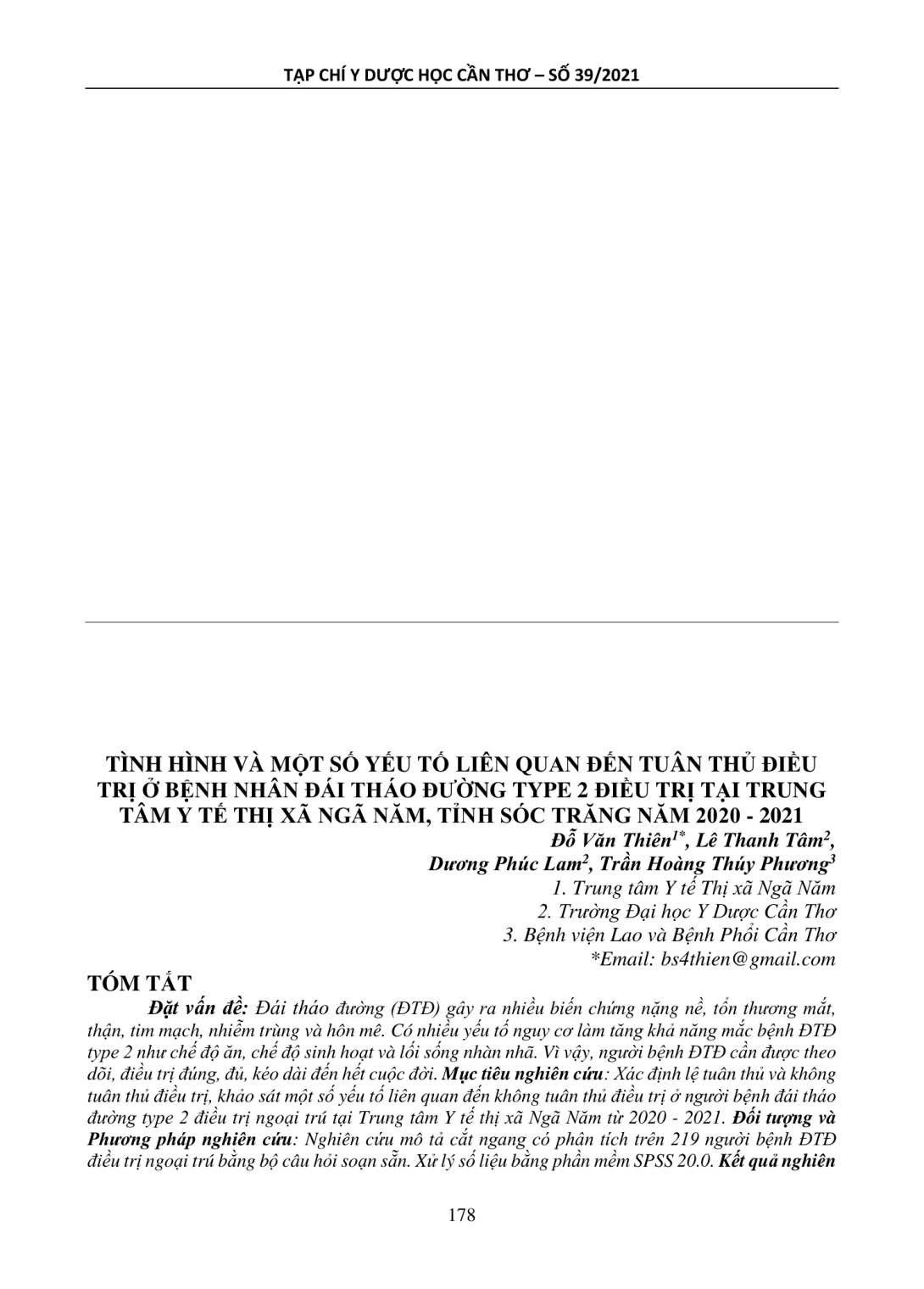Đái tháo đường (ĐTĐ) gây ra nhiều biến chứng nặng nề, tổn thương mắt, thận, tim mạch, nhiễm trùng và hôn mê. Có nhiều yếu tố nguy cơ làm tăng khả năng mắc bệnh ĐTĐ type 2 như chế độ ăn, chế độ sinh hoạt và lối sống nhàn nhã. Vì vậy, người bệnh ĐTĐ cần được theo dõi, điều trị đúng, đủ, kéo dài đến hết cuộc đời.Mục tiêu nghiên cứu: Xác định lệ tuân thủ và không tuân thủ điều trị, khảo sát một số yếu tố liên quan đến không tuân thủ điều trị ở người bệnh đái tháo đường type 2 điều trị ngoại trú tại Trung tâm Y tế thị xã Ngã Năm từ 2020 - 2021. Đối tượng và Phương pháp nghiên cứu: Nghiên cứu mô tả cắt ngang có phân tích trên 219 người bệnh ĐTĐ điều trị ngoại trú bằng bộ câu hỏi soạn sẵn. Xử lý số liệu bằng phần mềm SPSS 20.0. Kết quả nghiên cứu: Tỷ lệ không tuân thủ điều trị là 63%, tuân thủ là 37%. Những đối tượng có kiến thức chung chưa đúng và thái độ chưa hài lòng có tỷ lệ không tuân thủ điều trị cao. Sự khác biệt có ý nghĩa thống kê với p<0,05. Không tuân thủ điều trị có mối liên quan với các yếu tố bận rộn, sợ tác dụng phụ của thuốc, tiền thuốc tốn kém, thuốc quá nhiều, uống nhiều lần trong ngày và không thích dùng thuốc (p<0,05). Kết luận: Tỷ lệ tuân thủ điều trị ngoại trú bệnh ĐTĐ thấp (37,0%). Có mối liên quan giữa kiến thức, thái độ với tuân thủ điều trị bệnh ĐTĐ. Bên cạnh đó, có một số nguyên nhân khách quan dẫn đến không tuân thủ điều trị bệnh ĐTĐ.