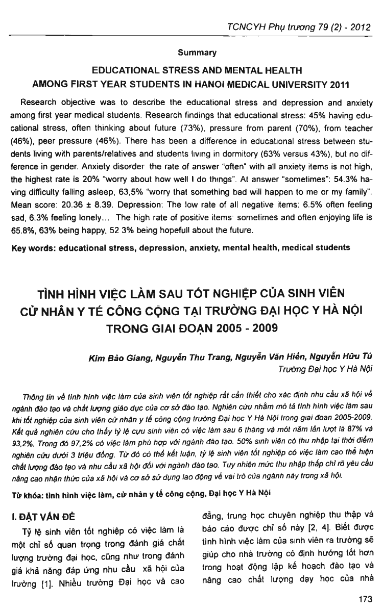 Knowledge about employment status of grad utes is useful for assessing need of society and education quality of a training institution. The study was to describe employment status of Public health graduates from Hanoi Medical University during the period between 2005 and 2009. The results showed that the employment rates of graduates after 6 months and one year since their graduation were 87 percent and 93.2 percent, respectively. Of them, 97.2 percent got a job that is closed to their training. 50 percent of graduates reported having a income level of less than VND 3 millions at the time of interview. In conclusion, high employment rate of graduates indicated quality of education as well as the need for this training category of the society. However, low income level points out the need to improve awareness about the importance and role of this profession in the society.