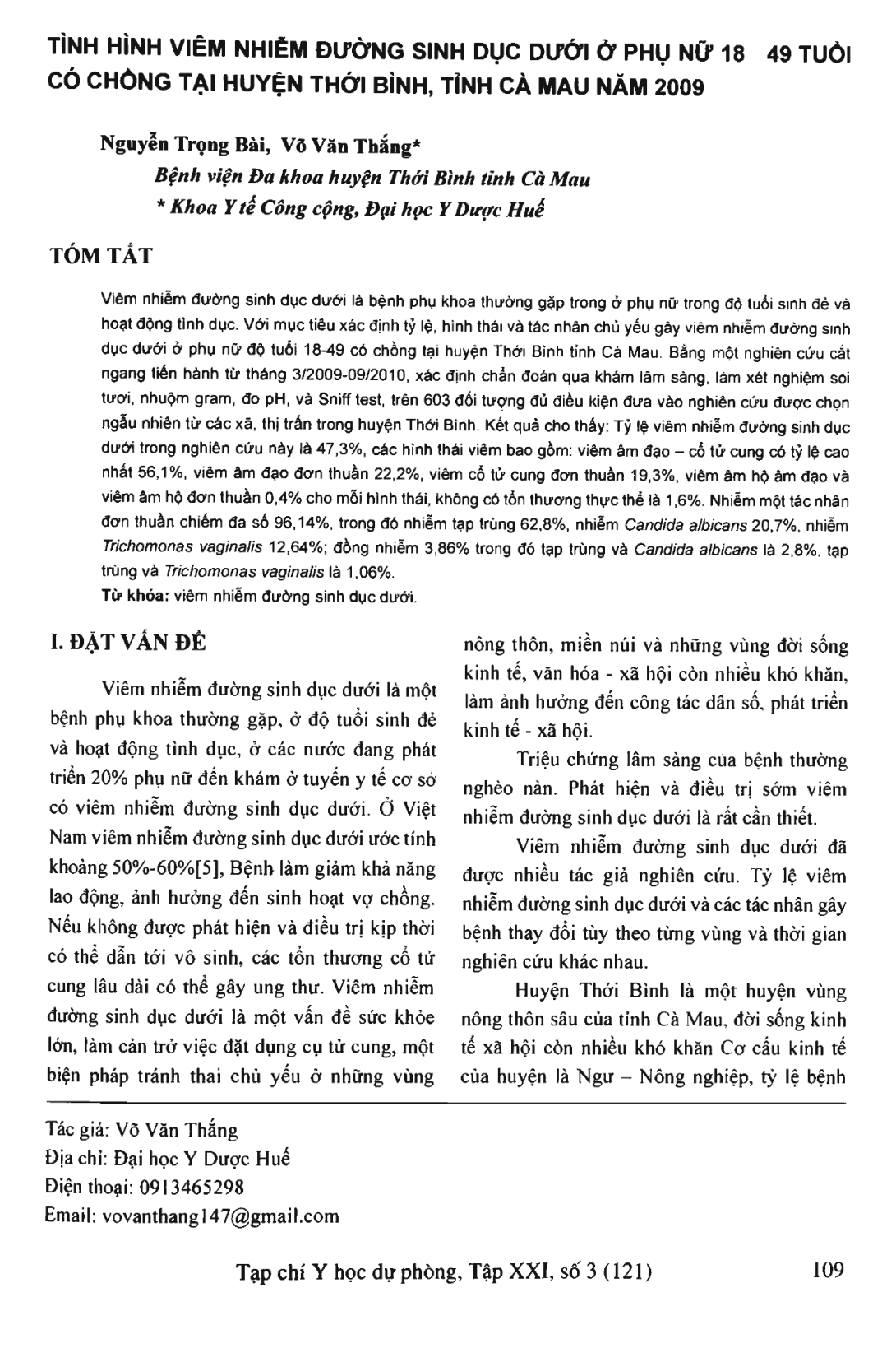 Tình hình viêm nhiễm đường sinh dục dưới ở phụ nữ 18-49 tuổi có chồng tại huyện Thới Bình. tỉnh Cà Mau năm 2009