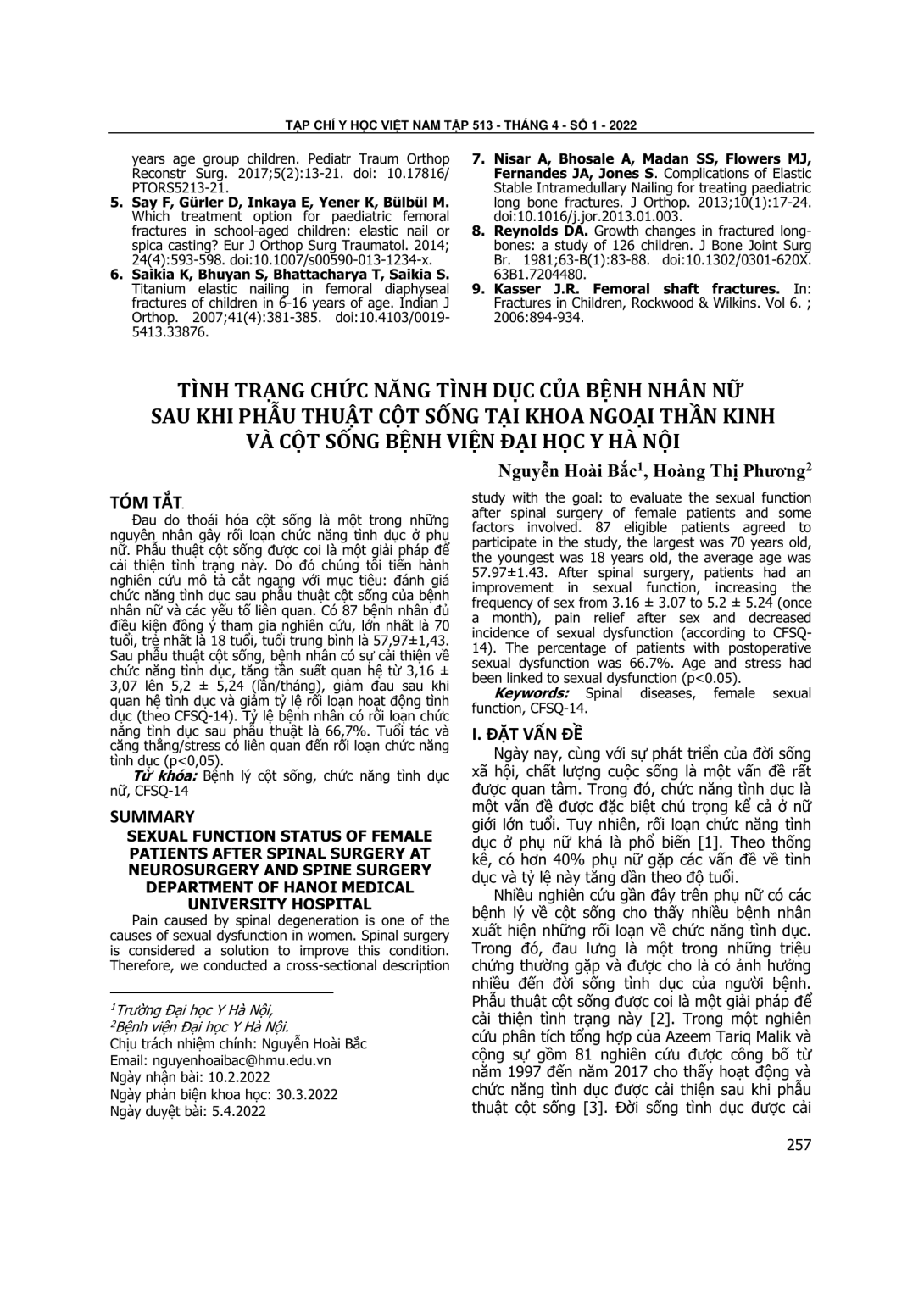 Đau do thoái hóa cột sống là một trong những nguyên nhân gây rối loạn chức năng tình dục ở phụ nữ. Phẫu thuật cột sống được coi là một giải pháp để cải thiện tình trạng này. Do đó chúng tôi tiến hành nghiên cứu mô tả cắt ngang với mục tiêu: đánh giá chức năng tình dục sau phẫu thuật cột sống của bệnh nhân nữ và các yếu tố liên quan. Có 87 bệnh nhân đủ điều kiện đồng ý tham gia nghiên cứu, lớn nhất là 70 tuổi, trẻ nhất là 18 tuổi, tuổi trung bình là 57,97±1,43. Sau phẫu thuật cột sống, bệnh nhân có sự cải thiện về chức năng tình dục, tăng tần suất quan hệ từ 3,16 ± 3,07 lên 5,2 ± 5,24 (lần/tháng), giảm đau sau khi quan hệ tình dục và giảm tỷ lệ rối loạn hoạt động tình dục (theo CFSQ-14). Tỷ lệ bệnh nhân có rối loạn chức năng tình dục sau phẫu thuật là 66,7%. Tuổi tác và căng thẳng/stress có liên quan đến rối loạn chức năng tình dục (p<0,05).