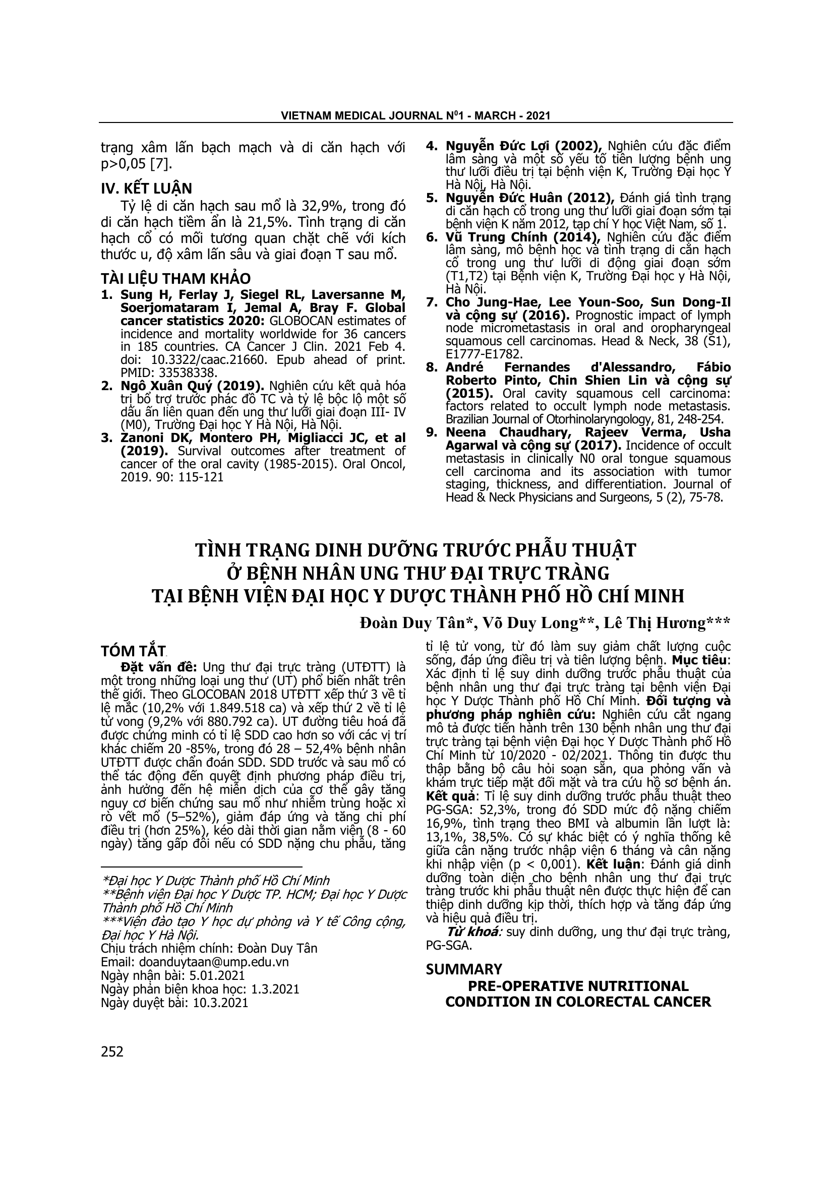 Ung thư đại trực tràng (UTĐTT) là một trong những loại ung thư (UT) phổ biến nhất trên thế giới. Theo GLOCOBAN 2018 UTĐTT xếp thứ 3 về tỉ lệ mắc (10,2% với 1.849.518 ca) và xếp thứ 2 về tỉ lệ tử vong (9,2% với 880.792 ca). UT đường tiêu hoá đã được chứng minh có tỉ lệ SDD cao hơn so với các vị trí khác chiếm 20 -85%, trong đó 28 – 52,4% bệnh nhân UTĐTT được chẩn đoán SDD. SDD trước và sau mổ có thể tác động đến quyết định phương pháp điều trị, ảnh hưởng đến hệ miễn dịch của cơ thể gây tăng nguy cơ biến chứng sau mổ như nhiễm trùng hoặc xì rò vết mổ (5–52%), giảm đáp ứng và tăng chi phí điều trị (hơn 25%), kéo dài thời gian nằm viện (8 - 60 ngày) tăng gấp đôi nếu có SDD nặng chu phẫu, tăng tỉ lệ tử vong, từ đó làm suy giảm chất lượng cuộc sống, đáp ứng điều trị và tiên lượng bệnh. Mục tiêu: Xác định tỉ lệ suy dinh dưỡng trước phẫu thuật của bệnh nhân ung thư đại trực tràng tại bệnh viện Đại học Y Dược Thành phố Hồ Chí Minh. Đối tượng và phương pháp nghiên cứu: Nghiên cứu cắt ngang mô tả được tiến hành trên 130 bệnh nhân ung thư đại trực tràng tại bệnh viện Đại học Y Dược Thành phố Hồ Chí Minh từ 10/2020 - 02/2021. Thông tin được thu thập bằng bộ câu hỏi soạn sẵn, qua phỏng vấn và khám trực tiếp mặt đối mặt và tra cứu hồ sơ bệnh án. Kết quả: Tỉ lệ suy dinh dưỡng trước phẫu thuật theo PG-SGA: 52,3%, trong đó SDD mức độ nặng chiếm 16,9%, tình trạng theo BMI và albumin lần lượt là: 13,1%, 38,5%. Có sự khác biệt có ý nghĩa thống kê giữa cân nặng trước nhập viện 6 tháng và cân nặng khi nhập viện (p < 0,001). Kết luận: Đánh giá dinh dưỡng toàn diện cho bệnh nhân ung thư đại trực tràng trước khi phẫu thuật nên được thực hiện để can thiệp dinh dưỡng kịp thời, thích hợp và tăng đáp ứng và hiệu quả điều trị.