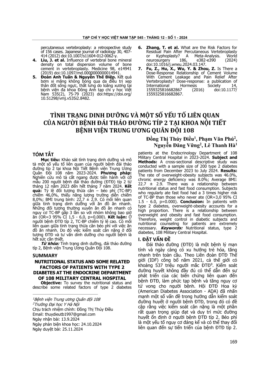 To survey the nutritional status and describe some related factors of type 2 diabetes patients at the Endocrinology Department of 108 Military Central Hospital in 2023-2024. Subject and Methods: A cross-sectional descriptive study was conducted with a sample size of 200 type 2 diabetes patients from December 2023 to July 2024. Results: The rate of overweight-obesity subjects was 46.0%, chronic energy deficiency was 8.0%; Average BMI: 22.7 ± 2.9. There was a relationship between nutritional status and fast food consumption. Subjects who regularly ate fast food had a 3 times higher risk of TC-BP than those who never ate (OR=3,0 95% CI 1.5 - 6.0, p=0.000). Conclusion: In patients with type 2 diabetes, overweight-obesity accounts for a high proportion. There is a relationship between overweight and obesity and fast food consumption. Therefore, weight control in diabetic subjects and nutritional counseling for patients are extremely necessary.