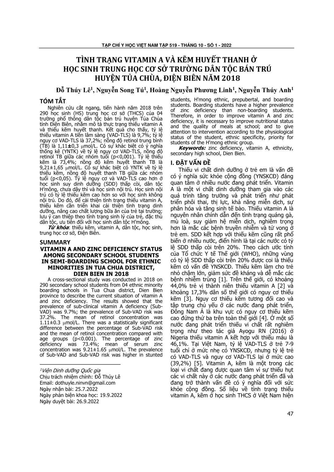 Nghiên cứu cắt ngang, tiến hành năm 2018 trên 290 học sinh (HS) trung học cơ sở (THCS) của 04 trường phổ thông dân tộc bán trú huyện Tủa Chùa tỉnh Điện Biên, nhằm mô tả thực trạng thiếu vitamin A và thiếu kẽm huyết thanh. Kết quả cho thấy, tỷ lệ thiếu vitamin A tiền lâm sàng (VAD-TLS) là 9,7%; tỷ lệ nguy cơ VAD-TLS là 37,2%; nồng độ retinol trung bình (TB) là 1,11±0,3 mol/L. Có sự khác biệt có ý nghĩa thống kê (YNTK) về tỷ lệ nguy cơ VAD-TLS, nồng độ retinol TB giữa các nhóm tuổi (p<0,001). Tỷ lệ thiếu kẽm là 73,4%; nồng độ kẽm huyết thanh TB là 9,21±1,65 mol/L. Có sự khác biệt có YNTK về tỷ lệ thiếu kẽm, nồng độ huyết thanh TB giữa các nhóm tuổi (p<0,05). Tỷ lệ nguy cơ và VAD-TLS cao hơn ở học sinh suy dinh dưỡng (SDD) thấp còi, dân tộc H’mông, chưa dậy thì và học sinh nội trú. Học sinh nội trú có tỷ lệ thiếu kẽm cao hơn so với học sinh không nội trú. Do đó, để cải thiện tình trạng thiếu vitamin A, thiếu kẽm cần triển khai cải thiện tình trạng dinh dưỡng, nâng cao chất lượng bữa ăn của trẻ tại trường; lưu ý can thiệp theo tình trạng sinh lý của trẻ, đặc thù dân tộc, ưu tiên đối với học sinh dân tộc H’mông.