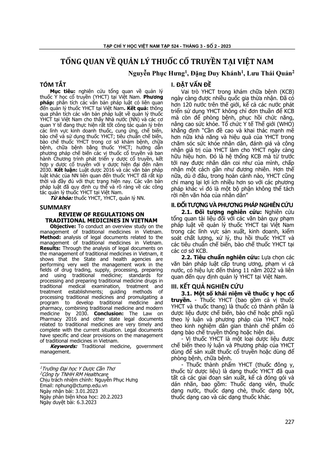 Nghiên cứu tổng quan về quản lý thuốc Y học cổ truyền (YHCT) tại Việt Nam. Phương pháp: phân tích các văn bản pháp luật có liên quan đến quản lý thuốc YHCT tại Việt Nam. Kết quả: thông qua phân tích các văn bản pháp luật về quản lý thuốc YHCT tại Việt Nam cho thấy Nhà nước (NN) và các cơ quan Y tế đang thực hiện rất tốt công tác quản lý trên các lĩnh vực kinh doanh thuốc, cung ứng, chế biến, bào chế và sử dụng thuốc YHCT; tiêu chuẩn chế biến, bào chế thuốc YHCT trong cơ sở khám bệnh, chữa bệnh, chữa bệnh bằng thuốc YHCT; hướng dẫn phương pháp chế biến các vị thuốc cổ truyền và ban hành Chương trình phát triển y dược cổ truyền, kết hợp y dược cổ truyền với y dược hiện đại đến năm 2030. Kết luận: Luật dược 2016 và các văn bản pháp luật khác của NN liên quan đến thuốc YHCT đã rất kịp thời và đầy đủ với thực trạng hiện nay. Các văn bản pháp luật đã quy định cụ thể và rõ ràng về các công tác quản lý thuốc YHCT tại Việt Nam.