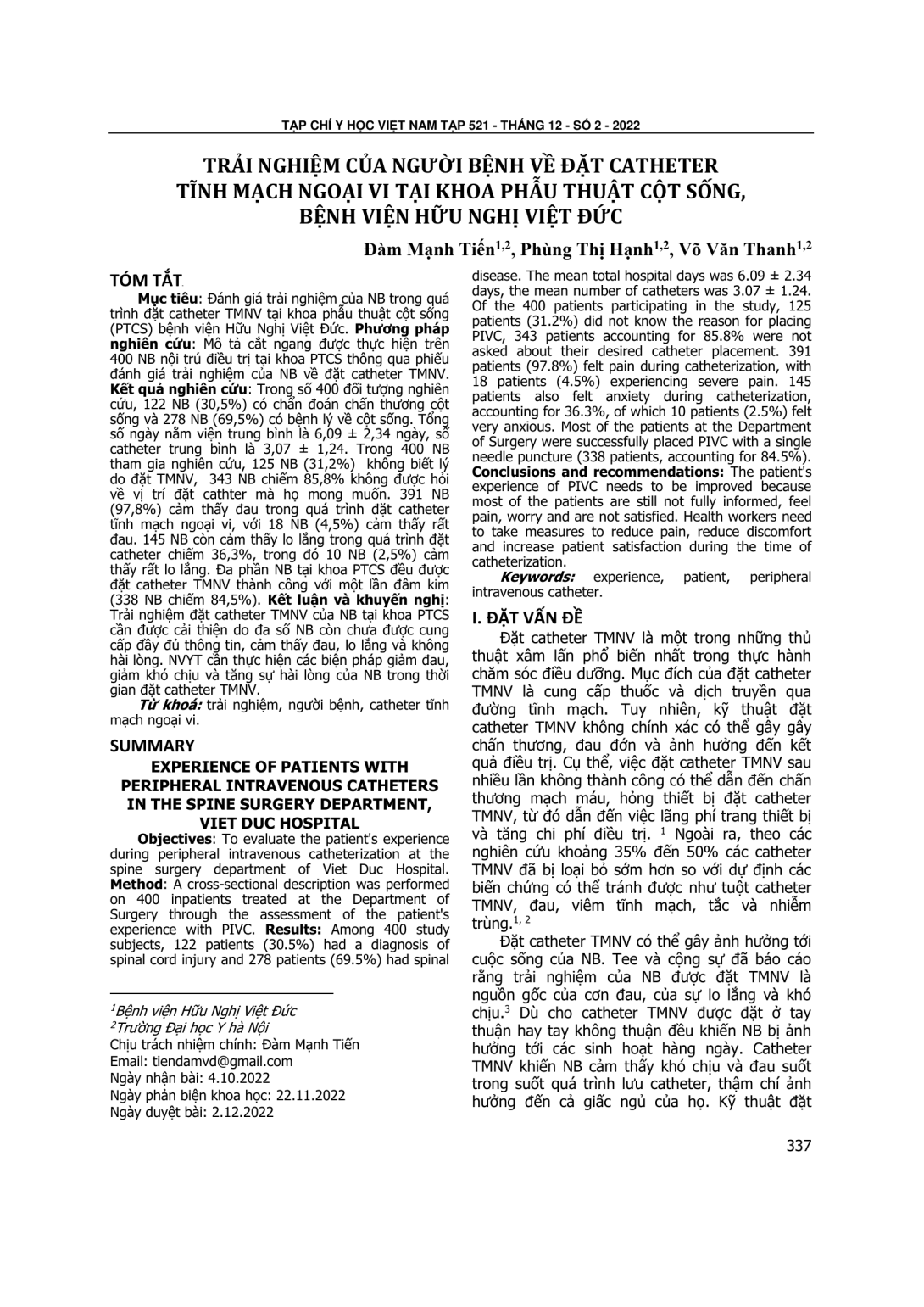 Đánh giá trải nghiệm của NB trong quá trình đặt catheter TMNV tại khoa phẫu thuật cột sống (PTCS) bệnh viện Hữu Nghị Việt Đức. Phương pháp nghiên cứu: Mô tả cắt ngang được thực hiện trên 400 NB nội trú điều trị tại khoa PTCS thông qua phiếu đánh giá trải nghiệm của NB về đặt catheter TMNV. Kết quả nghiên cứu: Trong số 400 đối tượng nghiên cứu, 122 NB (30,5%) có chẩn đoán chấn thương cột sống và 278 NB (69,5%) có bệnh lý về cột sống. Tổng số ngày nằm viện trung bình là 6,09 ± 2,34 ngày, số catheter trung bình là 3,07 ± 1,24. Trong 400 NB tham gia nghiên cứu, 125 NB (31,2%) không biết lý do đặt TMNV, 343 NB chiếm 85,8% không được hỏi về vị trí đặt cathter mà họ mong muốn. 391 NB (97,8%) cảm thấy đau trong quá trình đặt catheter tĩnh mạch ngoại vi, với 18 NB (4,5%) cảm thấy rất đau. 145 NB còn cảm thấy lo lắng trong quá trình đặt catheter chiếm 36,3%, trong đó 10 NB (2,5%) cảm thấy rất lo lắng. Đa phần NB tại khoa PTCS đều được đặt catheter TMNV thành công với một lần đâm kim (338 NB chiếm 84,5%). Kết luận và khuyến nghị: Trải nghiệm đặt catheter TMNV của NB tại khoa PTCS cần được cải thiện do đa số NB còn chưa được cung cấp đầy đủ thông tin, cảm thấy đau, lo lắng và không hài lòng. NVYT cần thực hiện các biện pháp giảm đau, giảm khó chịu và tăng sự hài lòng của NB trong thời gian đặt catheter TMNV.