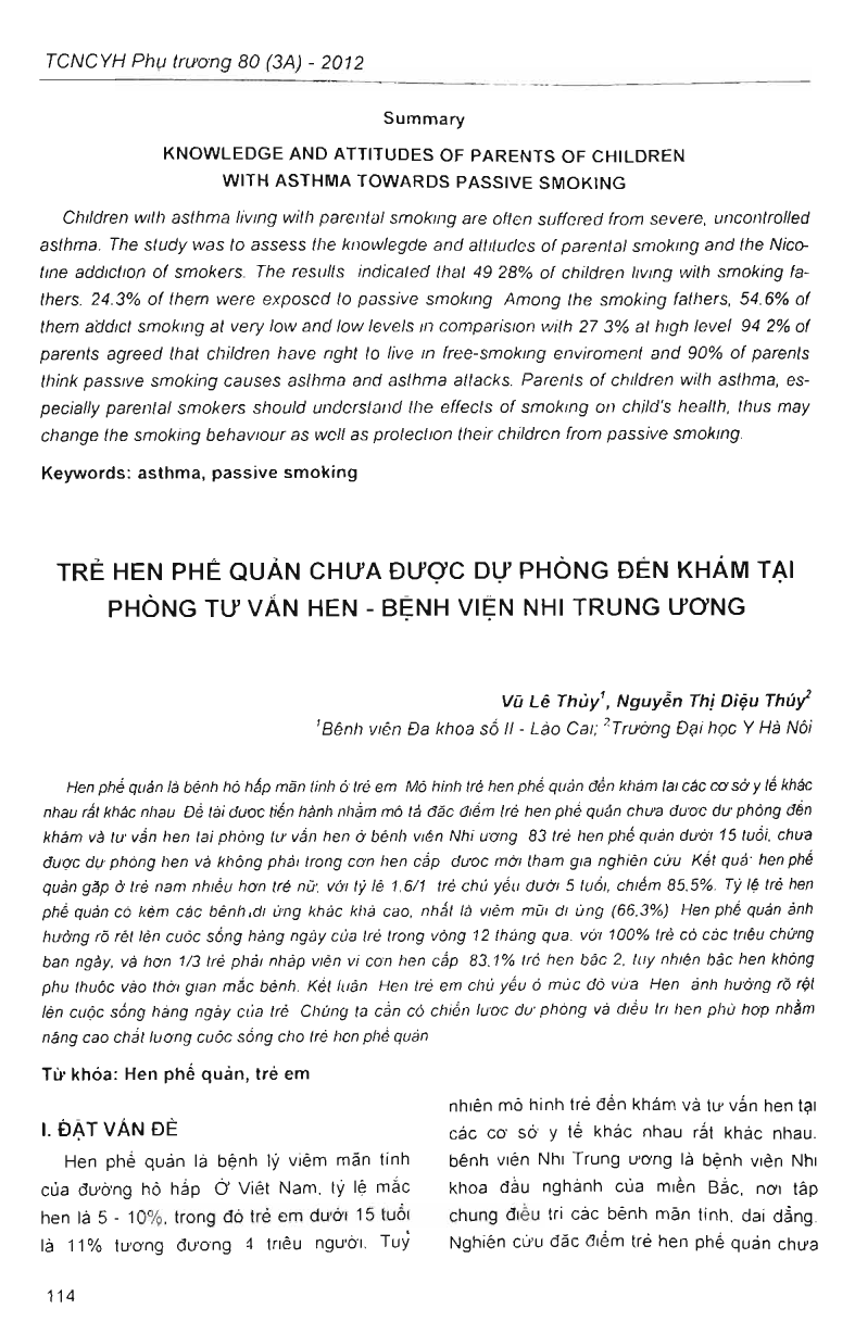 Asthma is a chronic respiratory disease in children. The pattern of asthmatic ch/Jdren admitted to medical office was different from places to places. The study was conducted to describle the characteristics of children with asthma without prvention who were examined at the asthma consultation office, National Hospital of Pediatrics. 83 children with asthma under 15 years of age, who had not asthma exacerbation and used preventive medication were invited to participate in the study. Asthma was higher in boys than gilrs, with boys/girls ratio was 1.6/1, mainly in children under 5 years of age (85.5 percent). The pre valance of allergic diseases in children with asthma was quite high, especially rhinitis (66.3 percent). Asthma were significantly affected on children's life in the previous 12 months, 100 percent of children had daily symptoms, and more than 1/3 of them had admitted to emergency department due to asthma exacerbation. 83.1 percent of children have second grade of asthma, however asthma grade was not depended on the duration of asthma. In conclusion children with asthma were mainly at moderate levels. Asthma were significantly affected on daily children activities. We should have a strategy for appropriate treatment and prevention in order to improve quality of life of children with asthma.