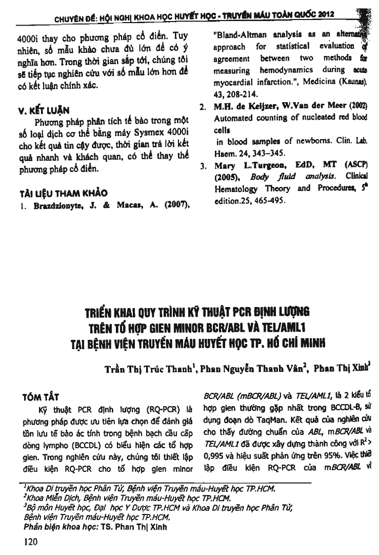 Real-time Quantitative Polymerase Chain Reaction (RQ-PCR) is the first technique of choice for detection of minimal residual disease in acute lymphoblastic leukemia (ALL) expressed fusion genes. In this research, the authors established conditions for TaqMan-based RQ-PCR of minor BCR/ABL (mBCR/ABL) and TEL/AML1 which are the most frequently occurring fusion genes in Blineage ALL (B-ALL). The results of this study showed that the standard curves of ABL, mBCR/ABL, and TEL/AML1 were set up successfully with R2 0.995, and PCR efficiency 95 percent. Establishing conditions for RQ-PCR of mBCR/ABL and TEL/AML1 fusion genes is the first step in standardizing minimal residual disease procedure in B-ALL at Blood Transfusion Hematology Hospital, Ho Chi Minh city.
