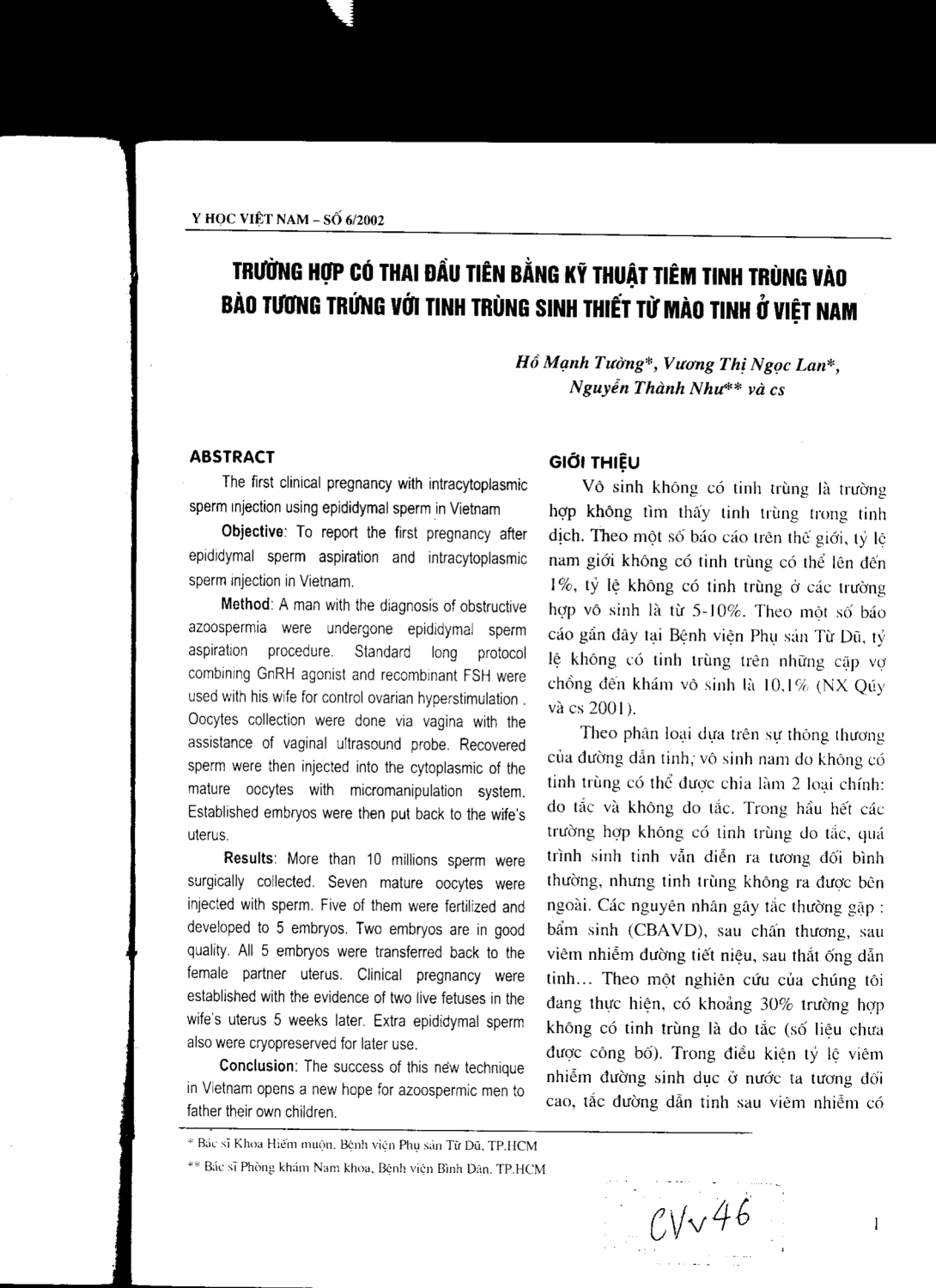 Trường hợp có thai đầu tiên bằng kỹ thuật tiêm tinh trùng vào bào tương trứng với tinh trùng sinh thiết từ mào tinh ở Việt Nam