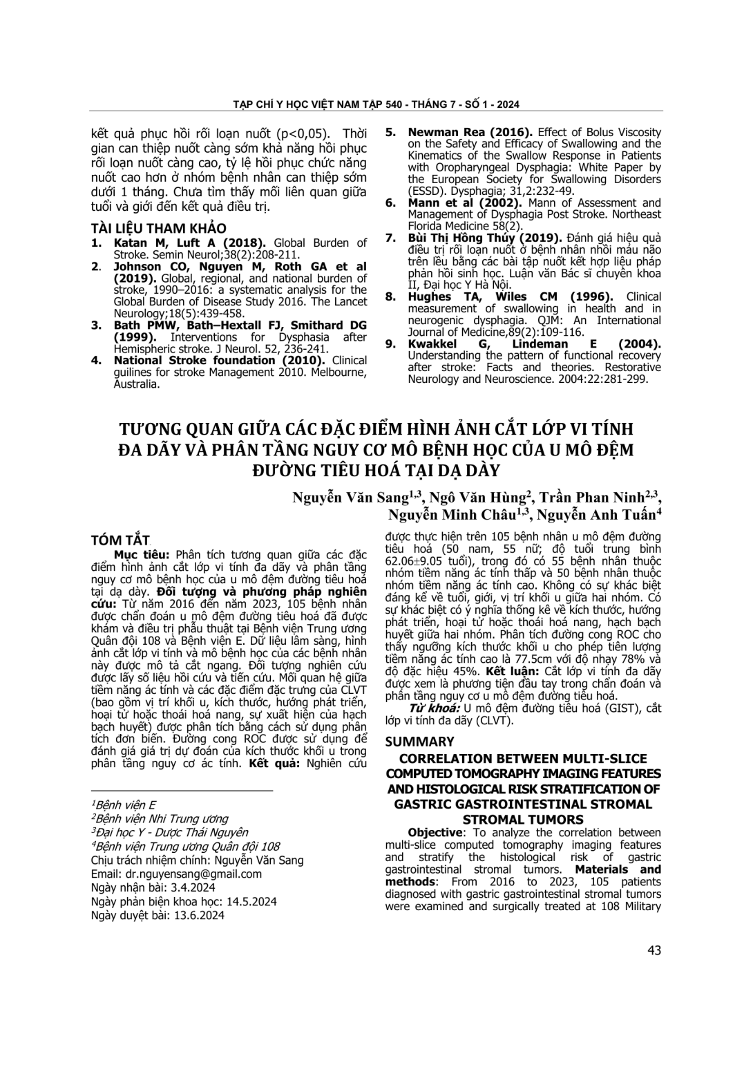 Phân tích tương quan giữa các đặc điểm hình ảnh cắt lớp vi tính đa dãy và phân tầng nguy cơ mô bệnh học của u mô đệm đường tiêu hoá tại dạ dày. Đối tượng và phương pháp nghiên cứu: Từ năm 2016 đến năm 2023, 105 bệnh nhân được chẩn đoán u mô đệm đường tiêu hoá đã được khám và điều trị phẫu thuật tại Bệnh viện Trung ương Quân đội 108 và Bệnh viện E. Dữ liệu lâm sàng, hình ảnh cắt lớp vi tính và mô bệnh học của các bệnh nhân này được mô tả cắt ngang. Đối tượng nghiên cứu được lấy số liệu hồi cứu và tiến cứu. Mối quan hệ giữa tiềm năng ác tính và các đặc điểm đặc trưng của CLVT (bao gồm vị trí khối u, kích thước, hướng phát triển, hoại tử hoặc thoái hoá nang, sự xuất hiện của hạch bạch huyết) được phân tích bằng cách sử dụng phân tích đơn biến. Đường cong ROC được sử dụng để đánh giá giá trị dự đoán của kích thước khối u trong phân tầng nguy cơ ác tính. Kết quả: Nghiên cứu được thực hiện trên 105 bệnh nhân u mô đệm đường tiêu hoá (50 nam, 55 nữ; độ tuổi trung bình 62.069.05 tuổi), trong đó có 55 bệnh nhân thuộc nhóm tiềm năng ác tính thấp và 50 bệnh nhân thuộc nhóm tiềm năng ác tính cao. Không có sự khác biệt đáng kể về tuổi, giới, vị trí khối u giữa hai nhóm. Có sự khác biệt có ý nghĩa thống kê về kích thước, hướng phát triển, hoại tử hoặc thoái hoá nang, hạch bạch huyết giữa hai nhóm. Phân tích đường cong ROC cho thấy ngưỡng kích thước khối u cho phép tiên lượng tiềm năng ác tính cao là 77.5cm với độ nhạy 78% và độ đặc hiệu 45%. Kết luận: Cắt lớp vi tính đa dãy được xem là phương tiện đầu tay trong chẩn đoán và phân tầng nguy cơ u mô đệm đường tiêu hoá.