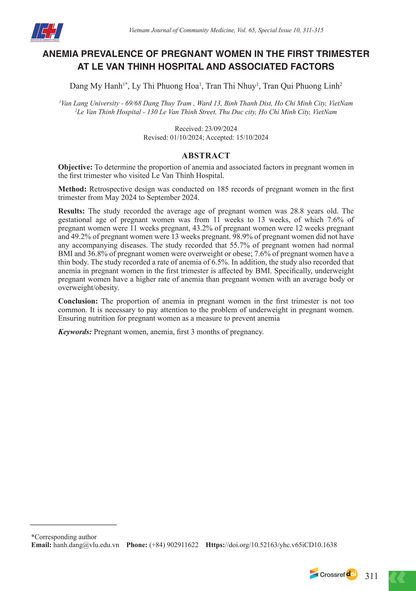 Xác định tỷ lệ thiếu máu và các yếu tố ảnh hưởng ở thai phụ 3 tháng đầu của thai kỳ đến khám tại Bệnh viện Lê Văn Thịnh. Phương pháp: Nghiên cứu phân tích hồi cứu trên 185 hồ sơ thai phụ 03 tháng đầu thai kỳ từ tháng 05/2024 đến tháng 09/2024.Kết quả: Nghiên cứu ghi nhận độ tuổi trung bình của thai phụ là 28,8 tuổi. Tuổi thai của thai phụ từ 11 tuần đến 13 tuần trong đó 7,6% thai phụ thai 11 tuần tuổi, 43,2% thai phụ thai 12 tuần tuổi và 49,2% thai phụ thai 13 tuần tuổi. 98,9% thai phụ không mắc các bệnh lý kèm theo. Nghiên cứu ghi nhận 55,7% thai phụ có BMI bình thường và 36,8% thai phụ có tình trạng dư cân, béo phì; 7,6% thai phụ có tổng trạng gầy. Nghiên cứu ghi nhận tỷ lệ thiếu máu là 6,5%. Bên cạnh đó, nghiên cứu cũng ghi nhận tình trạng thiếu máu của thai phụ 03 tháng đầu của thai kỳ ảnh hưởng bởi BMI. Cụ thể, thai phụ nhẹ cân gầy có tỷ lệ thiếu máu cao hơn thai phụ có tổng trạng trung bình hoặc dư cân, béo phì. Kết luận: Tỉ lệ thiếu máu ở thai phụ trong 03 tháng đầu thai kỳ không quá phổ biến. Tuy nhiên cần quan tâm đến vấn đề thiếu cân ở thai phụ. Đảm bảo dinh dưỡng cho thai phu như là biện pháp dự phòng thiếu máu.