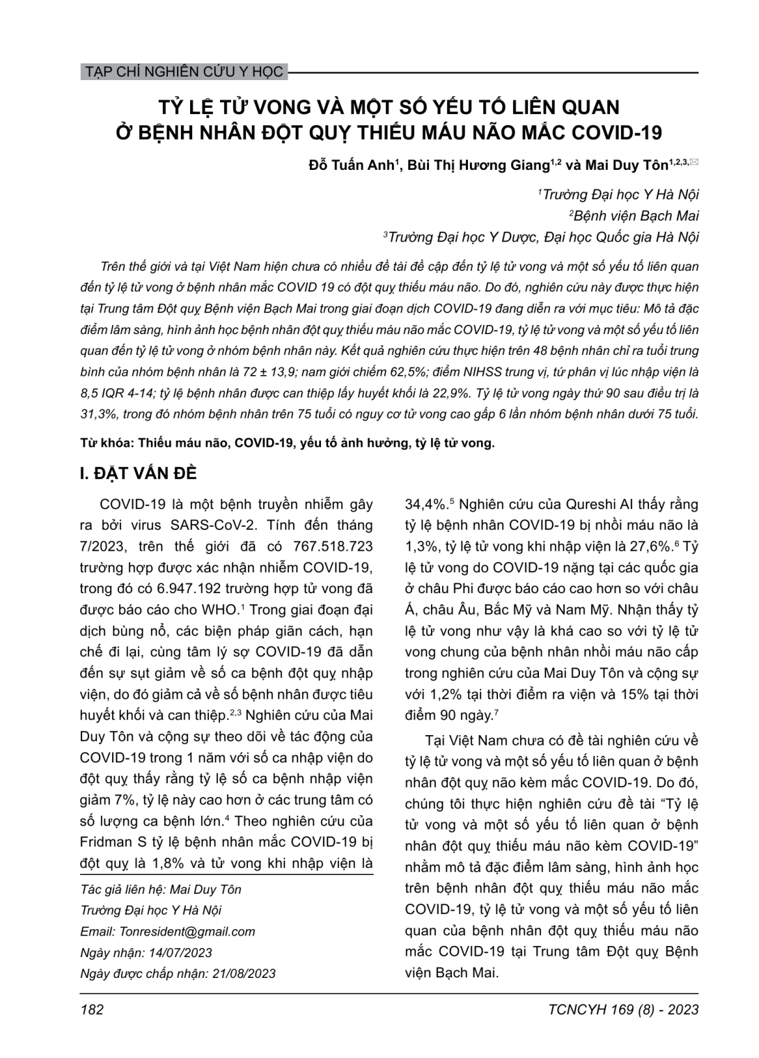 Trên thế giới và tại Việt Nam hiện chưa có nhiều đề tài đề cập đến tỷ lệ tử vong và một số yếu tố liên quan đến tỷ lệ tử vong ở bệnh nhân mắc COVID 19 có đột quỵ thiếu máu não. Do đó, nghiên cứu này được thực hiện tại Trung tâm Đột quỵ Bệnh viện Bạch Mai trong giai đoạn dịch COVID-19 đang diễn ra với mục tiêu: Mô tả đặc điểm lâm sàng, hình ảnh học bệnh nhân đột quỵ thiếu máu não mắc COVID-19, tỷ lệ tử vong và một số yếu tố liên quan đến tỷ lệ tử vong ở nhóm bệnh nhân này. Kết quả nghiên cứu thực hiện trên 48 bệnh nhân chỉ ra tuổi trung bình của nhóm bệnh nhân là 72 ± 13,9; nam giới chiếm 62,5%; điểm NIHSS trung vị, tứ phân vị lúc nhập viện là 8,5 IQR 4-14; tỷ lệ bệnh nhân được can thiệp lấy huyết khối là 22,9%. Tỷ lệ tử vong ngày thứ 90 sau điều trị là 31,3%, trong đó nhóm bệnh nhân trên 75 tuổi có nguy cơ tử vong cao gấp 6 lần nhóm bệnh nhân dưới 75 tuổi.