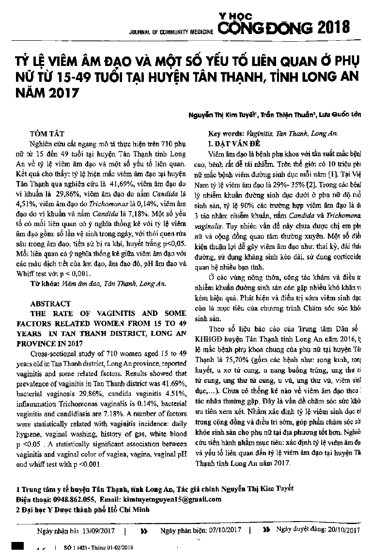 Nghiên cứu cắt ngang mô tả thực hiện trên 710 phụ nữ từ 15 đến 49 tuổi tại huyện Tân Thạnh tỉnh Long An về tỷ lệ viêm âm đạo và một số yếu tố liên quan. Kết quả cho thấy: tỷ lệ hiện mắc viêm âm đạo tại huyện Tân Thạnh qua nghiên cứu là 41,69 phần trăm, viêm âm đạo do vi khuẩn là 29,86 phần trăm, viêm âm đạo do nấm Candida là 4,51 phần trăm, viêm âm đạo do Trichomonas là 0,14 phần trăm, viêm âm đạo do vi khuẩn và nấm Candida là 7,18 phần trăm. Một số yếu tố có mối liên quan có ý nghĩa thống kê với tỷ lệ viêm âm đạo gồm: số lần vệ sinh trong ngày, với thói quen rửa sâu trong âm đạo, tiền sử bị ra khí, huyết trắng p0,05. Mối liên quan có ý nghĩa thống kê giữa viêm âm đạo với các màu dịch tiết của âm đạo, ấm đạo đỏ, pH âm đạo và Whiff test với p0,001.