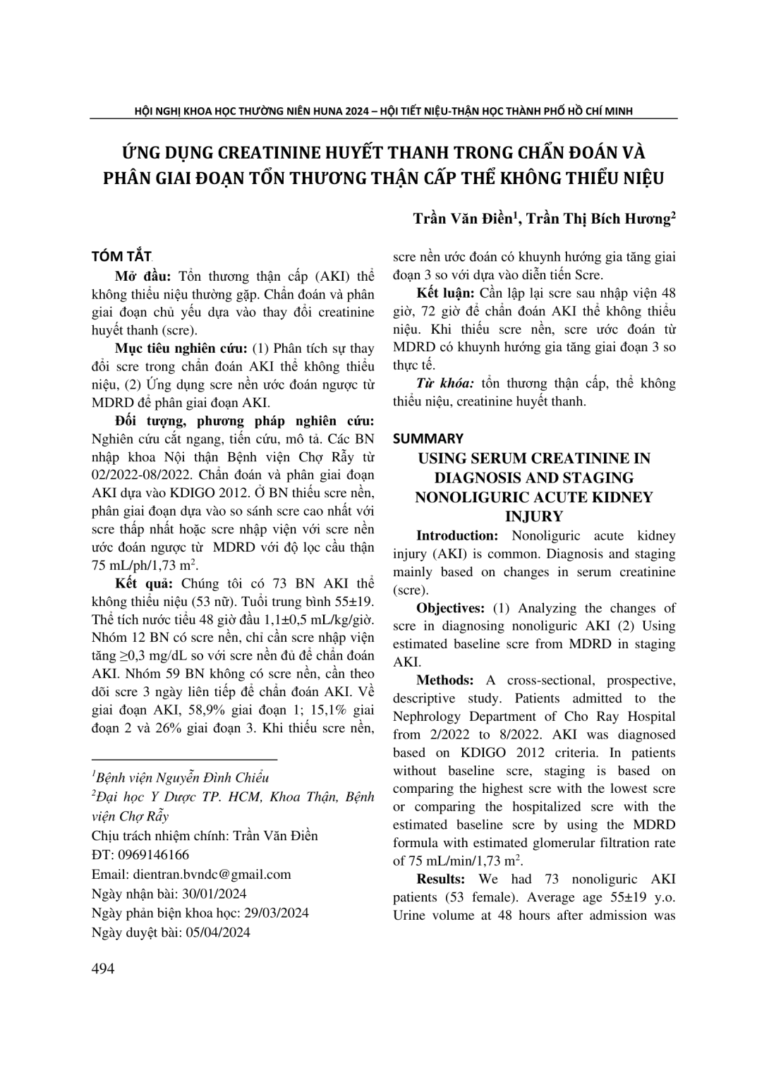 Phân tích sự thay đổi scre trong chẩn đoán AKI thể không thiểu niệu, Ứng dụng scre nền ước đoán ngược từ MDRD để phân giai đoạn AKI. Đối tượng, phương pháp nghiên cứu: Nghiên cứu cắt ngang, tiến cứu, mô tả. Các BN nhập khoa Nội thận Bệnh viện Chợ Rẫy từ 02/2022-08/2022. Chẩn đoán và phân giai đoạn AKI dựa vào KDIGO 2012. Ở BN thiếu scre nền, phân giai đoạn dựa vào so sánh scre cao nhất với scre thấp nhất hoặc scre nhập viện với scre nền ước đoán ngược từ MDRD với độ lọc cầu thận 75 mL/ph/1,73 m2. Kết quả: Chúng tôi có 73 BN AKI thể không thiểu niệu (53 nữ). Tuổi trung bình 55±19. Thể tích nước tiểu 48 giờ đầu 1,1±0,5 mL/kg/giờ. Nhóm 12 BN có scre nền, chỉ cần scre nhập viện tăng ≥0,3 mg/dL so với scre nền đủ để chẩn đoán AKI. Nhóm 59 BN không có scre nền, cần theo dõi scre 3 ngày liên tiếp để chẩn đoán AKI. Về giai đoạn AKI, 58,9% giai đoạn 1; 15,1% giai đoạn 2 và 26% giai đoạn 3. Khi thiếu scre nền, scre nền ước đoán có khuynh hướng gia tăng giai đoạn 3 so với dựa vào diễn tiến Scre. Kết luận: Cần lập lại scre sau nhập viện 48 giờ, 72 giờ để chẩn đoán AKI thể không thiểu niệu. Khi thiếu scre nền, scre ước đoán từ MDRD có khuynh hướng gia tăng giai đoạn 3 so thực tế.