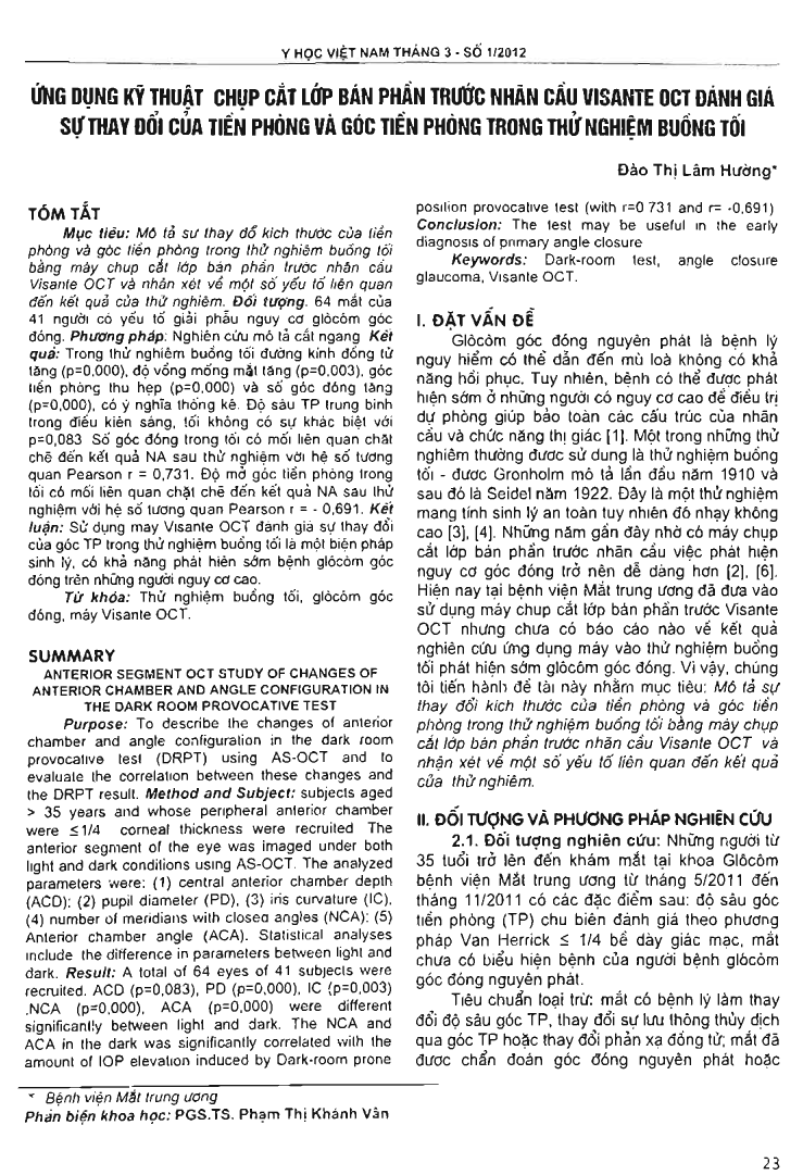 Purpose: To describe the changes of anterior chamber and angle configuration in the dark room provocative test (DRPT) using AS-OCT and to evaluate the correlation between these changes and the DRPT result. Method and Subject: subjects aged 35 years and whose peripheral anterior chamber were S 1/4 corneal thickness were recruited. The anterior segment of the eye was imaged under both light and dark conditions using AS-OCT. The analyzed parameters were: (1) central anterior chamber depth (ACD); (2) pupil diameter (PD); (3) iris curvature (IC); (4) number of meridians with closed angles (NCA); (5) Anterior chamber angle (ACA). Statistical analyses include: the difference in parameters between light and dark. Result: A total of 64 eyes of 41 subjects were recruited. ACD (p = 0.083), PD (p=0.000), IC (p=0.003) ,NCA (p=0.000), ACA (p=0.000) were different significantly between light and dark. The NCA and ACA in the dark was significantly correlated with the amount of IOP elevation induced by Dark-room prone position provocative test (with r=0.731 and r= -0.691). Conclusion: The test may be useful in the early diagnosis of primary angle closure.