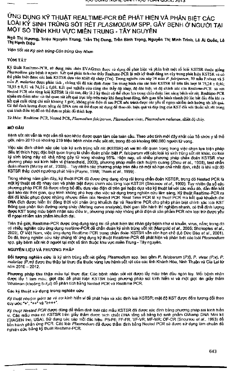 ứng dụng kỹ thuật Realtime PCR để phát hiện và phân biệt các loại ký sinh trùng sốt rét Plasmodium spp. gây bệnh ở người tại một số tỉnh khu vực miền Trung - Tây Nguyên