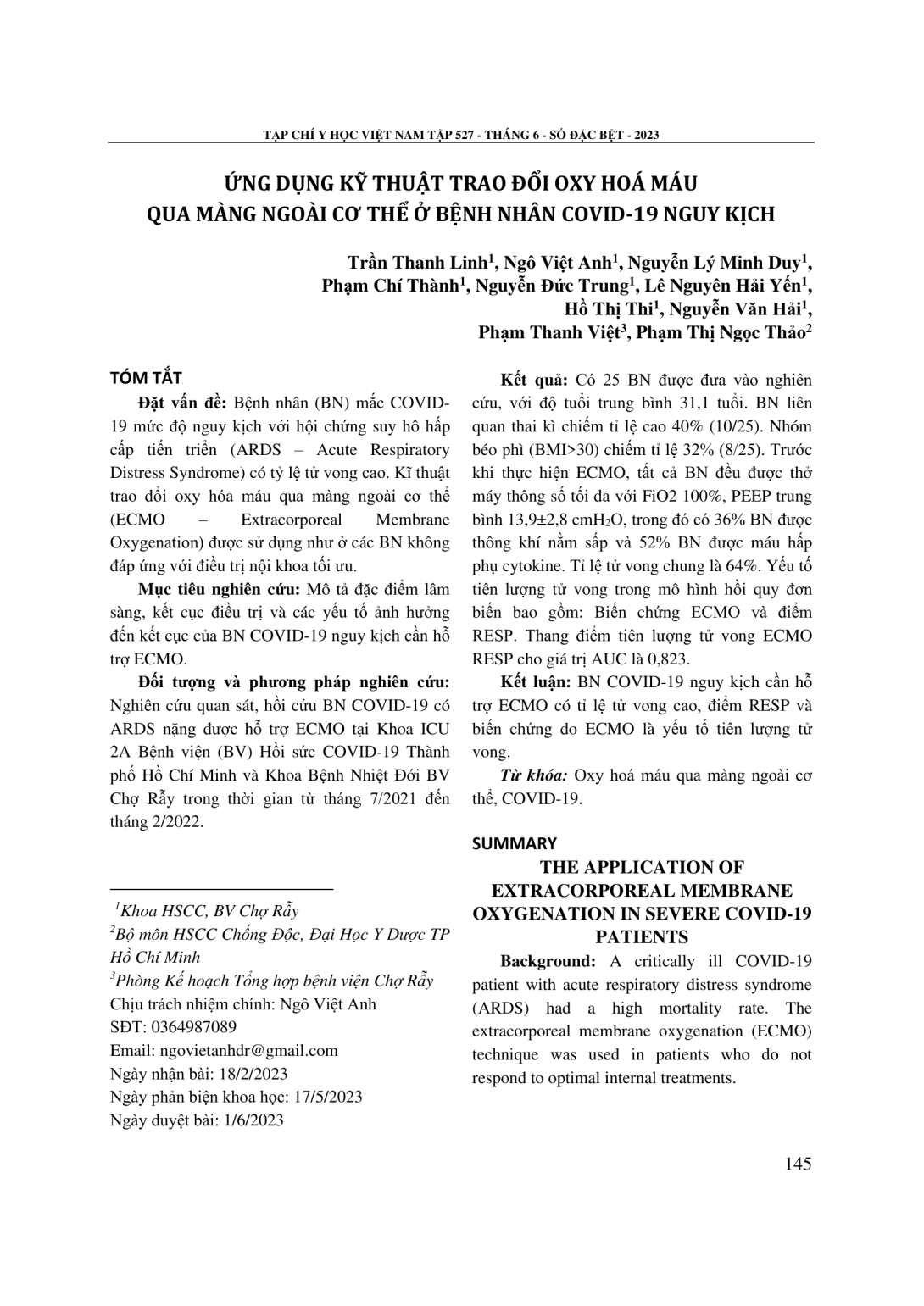 Bệnh nhân (BN) mắc COVID-19 mức độ nguy kịch với hội chứng suy hô hấp cấp tiến triển (ARDS – Acute Respiratory Distress Syndrome) có tỷ lệ tử vong cao. Kĩ thuật trao đổi oxy hóa máu qua màng ngoài cơ thể (ECMO – Extracorporeal Membrane Oxygenation) được sử dụng như ở các BN không đáp ứng với điều trị nội khoa tối ưu. Mô tả đặc điểm lâm sàng, kết cục điều trị và các yếu tố ảnh hưởng đến kết cục của BN COVID-19 nguy kịch cần hỗ trợ ECMO. Nghiên cứu quan sát, hồi cứu BN COVID-19 có ARDS nặng được hỗ trợ ECMO tại Khoa ICU 2A Bệnh viện (BV) Hồi sức COVID-19 Thành phố Hồ Chí Minh và Khoa Bệnh Nhiệt Đới BV Chợ Rẫy trong thời gian từ tháng 7/2021 đến tháng 2/2022. Có 25 BN được đưa vào nghiên cứu, với độ tuổi trung bình 31,1 tuổi. BN liên quan thai kì chiếm tỉ lệ cao 40% (10/25). Nhóm béo phì (BMI>30) chiếm tỉ lệ 32% (8/25). Trước khi thực hiện ECMO, tất cả BN đều được thở máy thông số tối đa với FiO2 100%, PEEP trung bình 13,9±2,8 cmH2O, trong đó có 36% BN được thông khí nằm sấp và 52% BN được máu hấp phụ cytokine. Tỉ lệ tử vong chung là 64%. Yếu tố tiên lượng tử vong trong mô hình hồi quy đơn biến bao gồm: Biến chứng ECMO và điểm RESP. Thang điểm tiên lượng tử vong ECMO RESP cho giá trị AUC là 0,823. BN COVID-19 nguy kịch cần hỗ trợ ECMO có tỉ lệ tử vong cao, điểm RESP và biến chứng do ECMO là yếu tố tiên lượng tử vong.