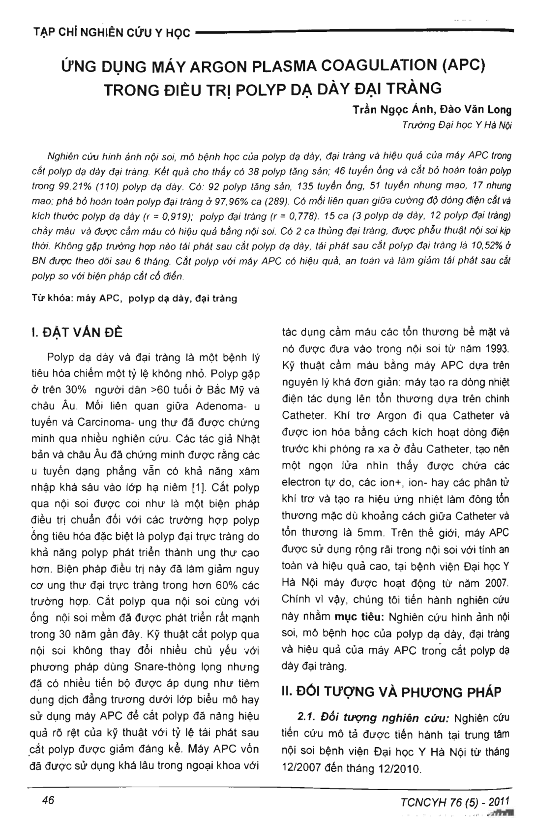 The aim of the study was to search for clinical parameters useful in predicting the efficacy of argon plasma coagulation (APC) and to assess the outcome and safety of this technique in the management of gastric and colorectal polyp remnants after polypectomy. Results show that pathologic examination revealed 38 hyperplastic polyps and 46 tubular adenomas of the stomach. Effective destruction of polyp remnants was achieved in 110 (98.21 percent) gastric polyps. Among colonic polyps there were: 92 hyperplastic, 135 tubular, 51 tubulo-villous, 17 villous. .Effective diestruction of remnanl polyp tissue was optained in 289 (97.96 percent) polyps. Sjgnificant positive cor-relation was demonstrated between the power output, and size of gastric polyp (r = 0.919), colorectal polyps (r = 0.778). Bleeding in 15 cases were successfule endoscopic hemostasis. 2 cases perforation. The adenoma recurrence rate was 0 percent in polyp of gastric (n = 56) and 10.52 percent in colorectal polyp (n = 76) during follow-up period of 6 months. Thus, APC is an effective, safe method and minimally invasive therapy and more effective for the management of polyp remnants in the stomach and colon compared with traditional endoscopy therapy.