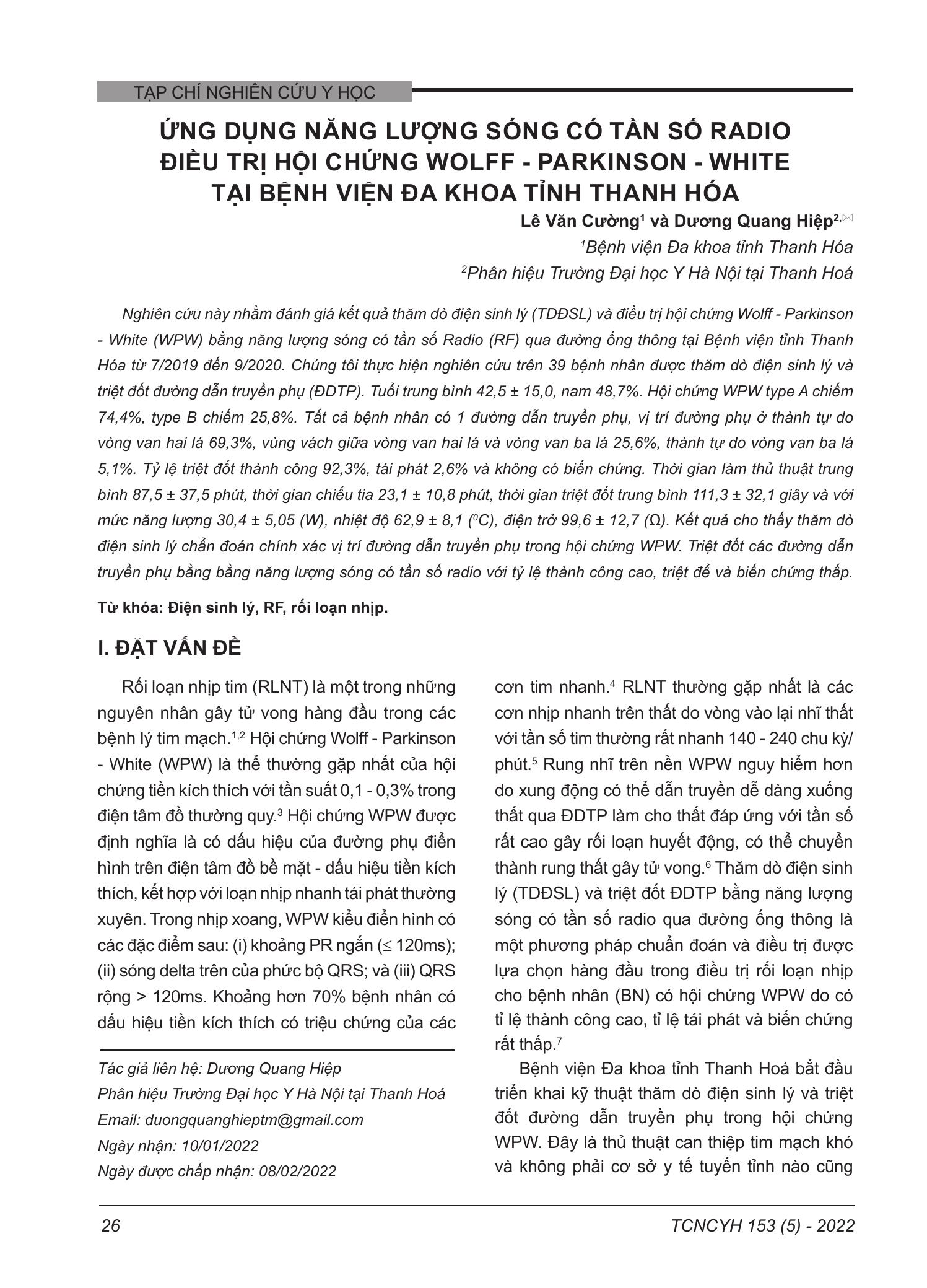Nghiên cứu này nhằm đánh giá kết quả thăm dò điện sinh lý (TDĐSL) và điều trị hội chứng Wolff - Parkinson - White (WPW) bằng năng lượng sóng có tần số Radio (RF) qua đường ống thông tại Bệnh viện tỉnh Thanh Hóa từ 7/2019 đến 9/2020. Chúng tôi thực hiện nghiên cứu trên 39 bệnh nhân được thăm dò điện sinh lý và triệt đốt đường dẫn truyền phụ (ĐDTP). Tuổi trung bình 42,5 ± 15,0, nam 48,7%. Hội chứng WPW type A chiếm 74,4%, type B chiếm 25,8%. Tất cả bệnh nhân có 1 đường dẫn truyền phụ, vị trí đường phụ ở thành tự do vòng van hai lá 69,3%, vùng vách giữa vòng van hai lá và vòng van ba lá 25,6%, thành tự do vòng van ba lá 5,1%. Tỷ lệ triệt đốt thành công 92,3%, tái phát 2,6% và không có biến chứng. Thời gian làm thủ thuật trung bình 87,5 ± 37,5 phút, thời gian chiếu tia 23,1 ± 10,8 phút, thời gian triệt đốt trung bình 111,3 ± 32,1 giây và với mức năng lượng 30,4 ± 5,05 (W), nhiệt độ 62,9 ± 8,1 (0C), điện trở 99,6 ± 12,7 (Ω). Kết quả cho thấy thăm dò điện sinh lý chẩn đoán chính xác vị trí đường dẫn truyền phụ trong hội chứng WPW. Triệt đốt các đường dẫn truyền phụ bằng bằng năng lượng sóng có tần số radio với tỷ lệ thành công cao, triệt để và biến chứng thấp.