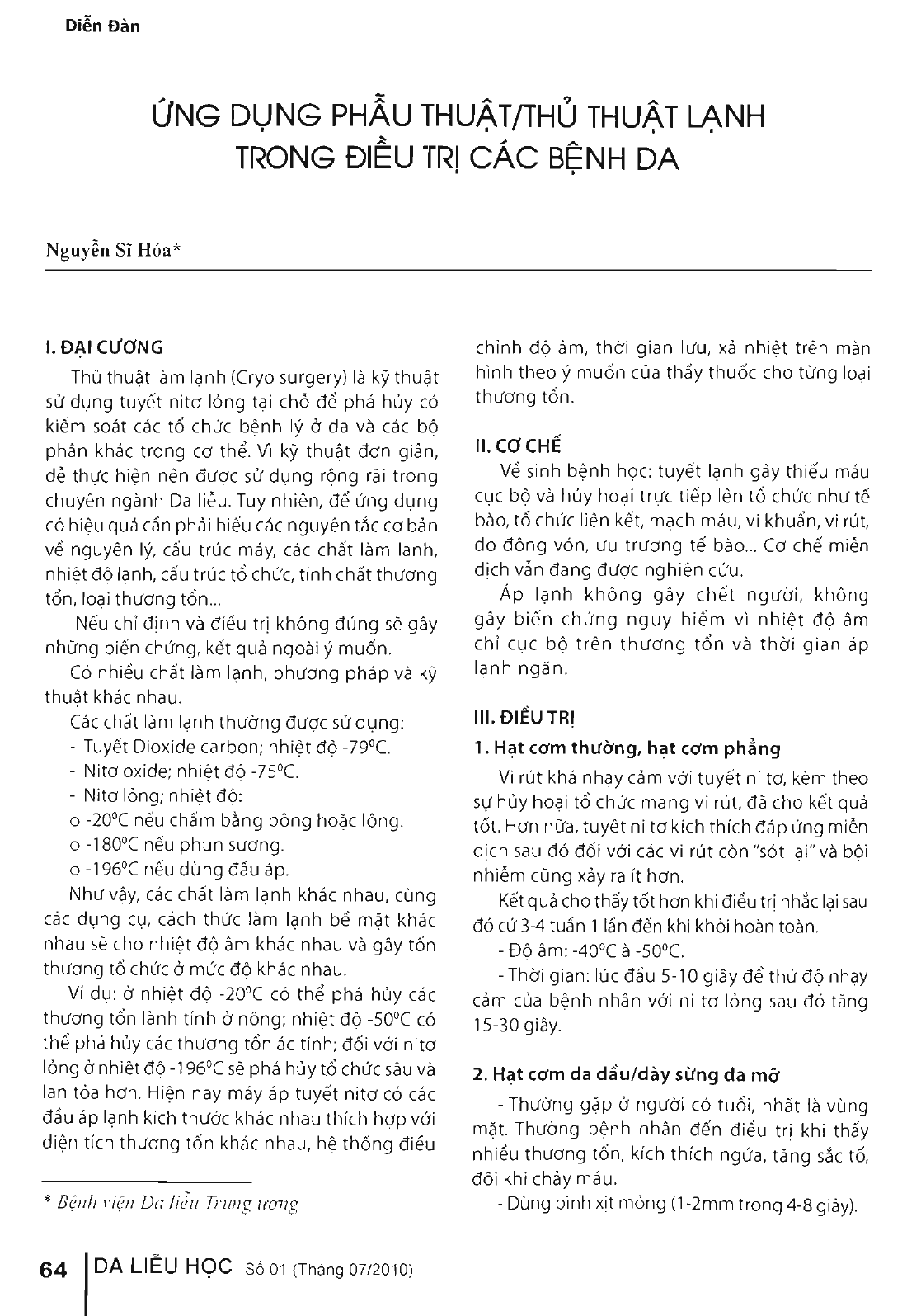 ứng dụng phẫu thuật, thủ thuật lạnh trong điều trị các bệnh da