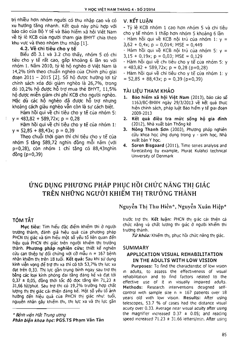 The study was conducted on analysis of secondary data from the Household Living Standards Survey 2002-2012. Research methods Included: -Economic and statistic analysis of associations and comparisons, -Trend analysis by simple regression for forecasting. Observations were made as follows: -The use rate of medical services in group 1 (poorest) was higher than in group 5 (richest) while spending for medical services in group 5 (richest) was higher than in group 1 (poorest) about 6 times higher; -The regression equation of hospital/clinical in patient group 1 (poorest) was y=3.62+0.4x with p=0.014 and MSE=0.449; -The regression equation of hospital, clinical in patient group 5 was y=3.15+0.19x with p=0.03 and MSE=0.129; -The regression equation of health spending in group 5 (richset) was y=483,82+589,72x with p=0,28 (p=0,28); -The regression equation of spending for medical services in group 1 (poorest) was y=52.85+88.43x with p=0,39 (p=0.39).