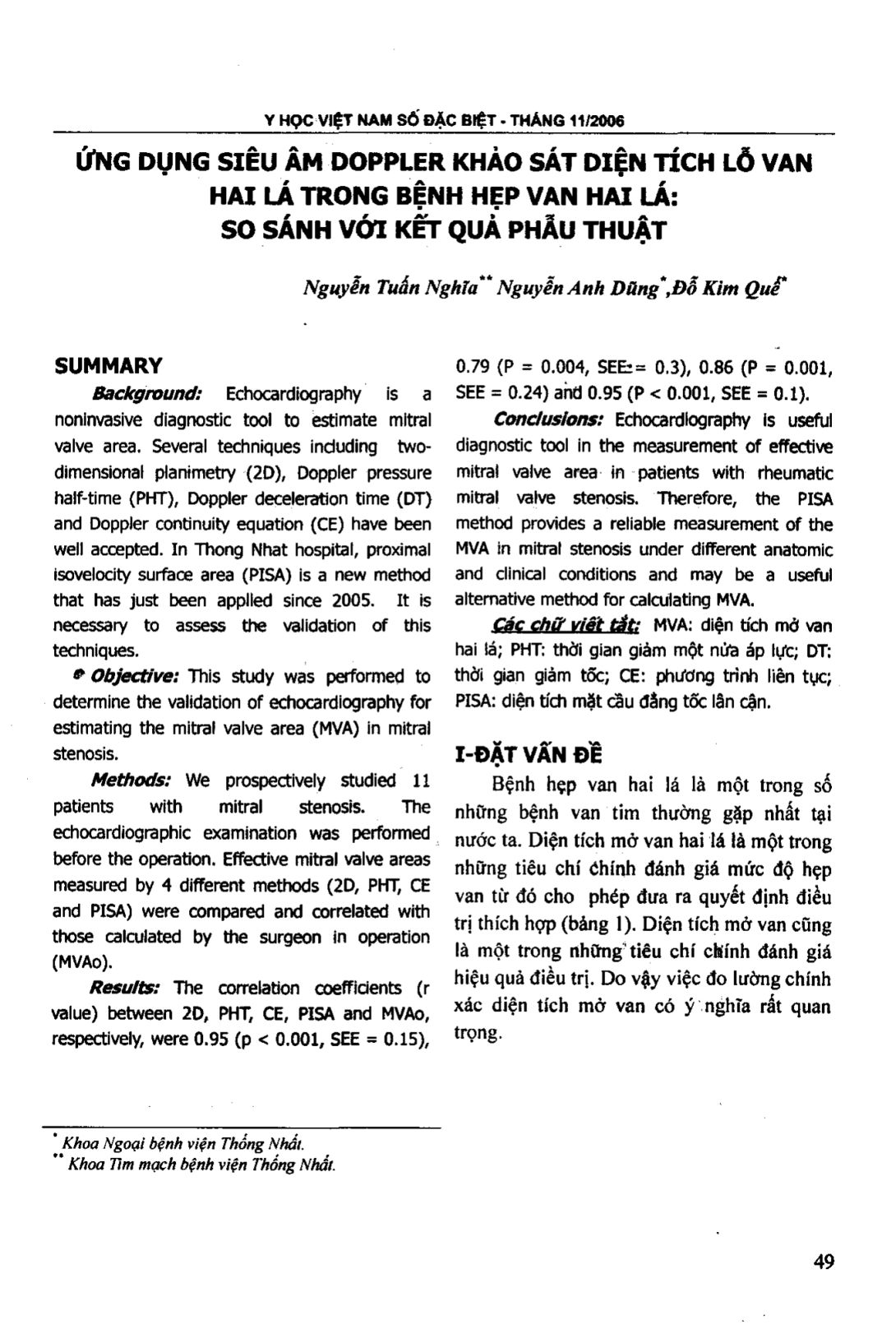ứng dụng siêu âm Doppler khảo sát diện tích lỗ van hai lá trong bệnh hẹp van hai lá: so sánh với kết quả phẫu thuật
