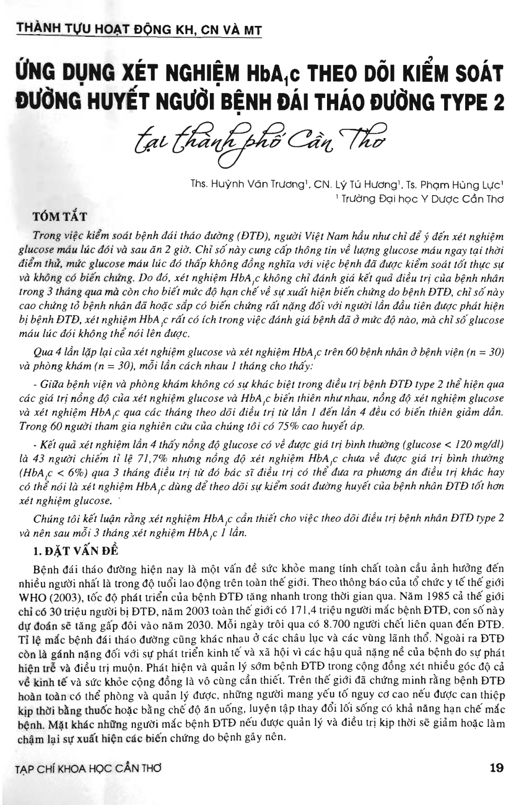 ứng dụng xét nghiệm HbA1c theo dõi kiểm soát đường huyết người bệnh đái tháo đường type 2 tại thành phố Cần Thơ.