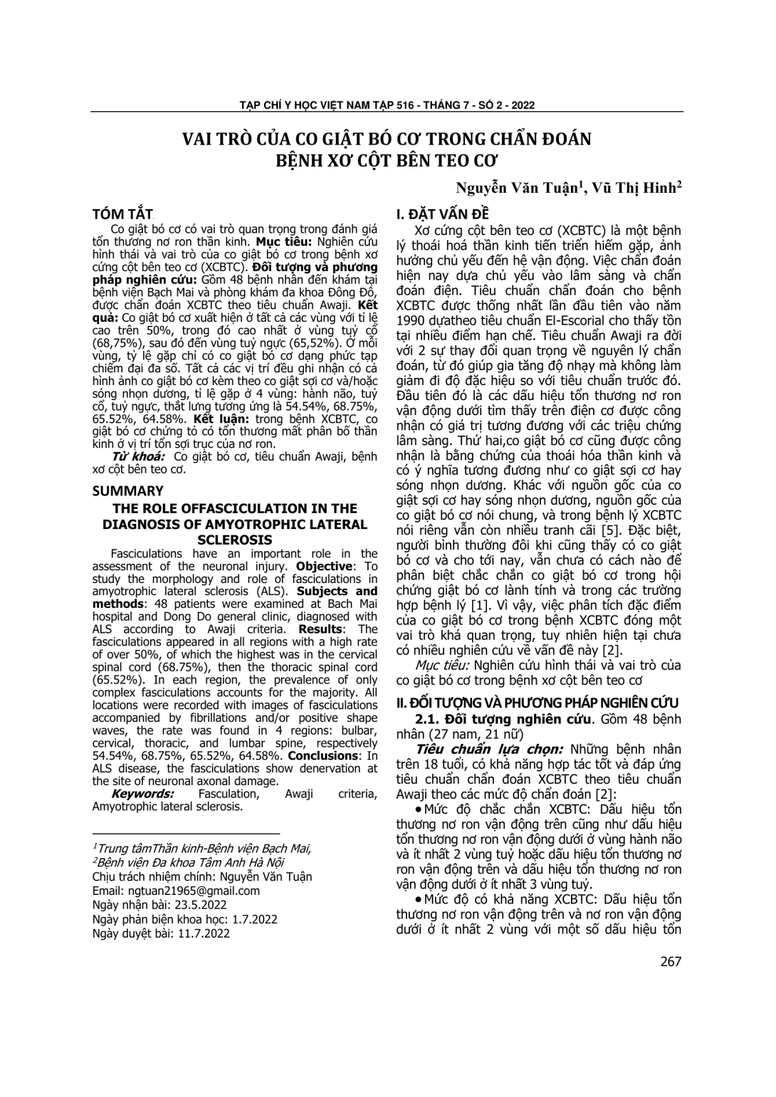 Co giật bó cơ có vai trò quan trọng trong đánh giá tổn thương nơ ron thần kinh. Mục tiêu: Nghiên cứu hình thái và vai trò của co giật bó cơ trong bệnh xơ cứng cột bên teo cơ (XCBTC). Đối tượng và phương pháp nghiên cứu: Gồm 48 bệnh nhân đến khám tại bệnh viện Bạch Mai và phòng khám đa khoa Đông Đô, được chẩn đoán XCBTC theo tiêu chuẩn Awaji. Kết quả: Co giật bó cơ xuất hiện ở tất cả các vùng với tỉ lệ cao trên 50%, trong đó cao nhất ở vùng tuỷ cổ (68,75%), sau đó đến vùng tuỷ ngực (65,52%). Ở mỗi vùng, tỷ lệ gặp chỉ có co giật bó cơ dạng phức tạp chiếm đại đa số. Tất cả các vị trí đều ghi nhận có cả hình ảnh co giật bó cơ kèm theo co giật sợi cơ và/hoặc sóng nhọn dương, tỉ lệ gặp ở 4 vùng: hành não, tuỷ cổ, tuỷ ngực, thắt lưng tương ứng là 54.54%, 68.75%, 65.52%, 64.58%. Kết luận: trong bệnh XCBTC, co giật bó cơ chứng tỏ có tổn thương mất phân bố thần kinh ở vị trí tổn sợi trục của nơ ron.