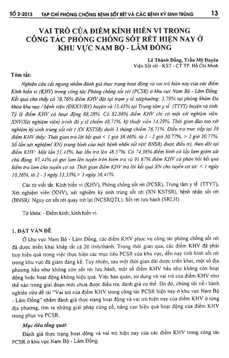 A Cross-sectional study was carried out to evaluate the current situation and the role of microscopic points in malaria control activities in the Southern region - Lam Dong. The results showed that 78.76 percent of the microscopic points were located at conununalldistrict medical aid posts; 5.79 percent at regional clinics/provincial hospitals and 15.45 percent at health centers of the districts and provinces. 88.28 percent of the microscopic points were active. 82.86 percent of microscopic points points had only one examiner. 48.71 percent of the examiners were qualified as physicians and 14.29 percent were technicians. The time duration for parasitic malaria examination training below 3 months accounted for 76.71 percent. A direct survey at 39 microscopic points produced the results as follows: Response time for displaying results below 1 hour was 38.46 percent, from 1-2 hours was 30.77 percent, over 2 hours was 30.77 percent. The average number of tests of a malaria patient who was treated and examined once at microscopic points was 51.43 percent, twice and more was 48.57 percent. 74.36 percent of the microscopic points actively took slide examination, 97.44 percent sent slides to the higher level and 91.67 percent made a response to slide check for the lower level. Response time for displaying test results of microscopic points to the lower level was 10.26 percent (for response time below 1 day), 33.33 percent (for response time from 2-3 days), and 56.41 percent (for response time above 3 days).