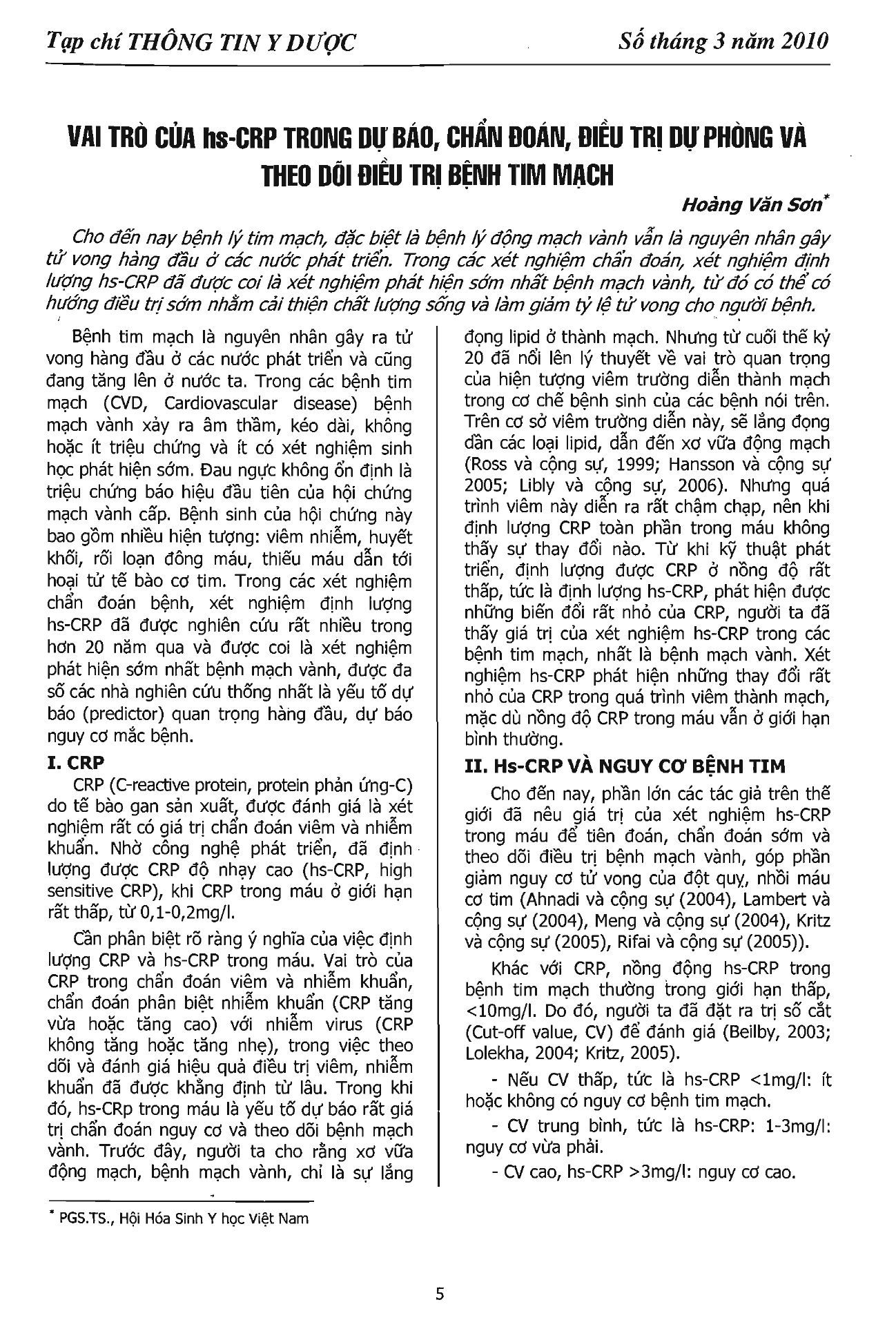 Vai trò của hs-CRP trong dự báo, chẩn đoán, điều trị dự phòng và theo dõi điều trị bệnh tim mạch