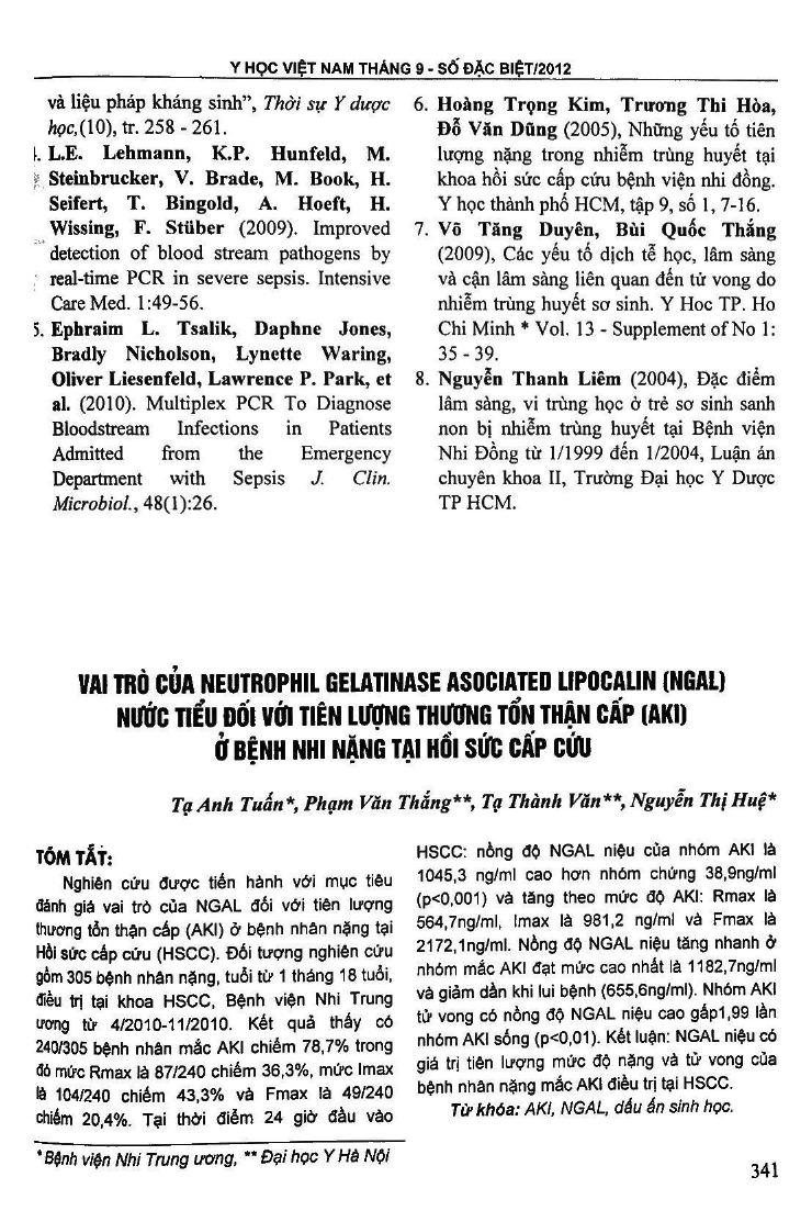 The research was performed for the assesement of the role of NGAL in the prognosis of AKI in PICU. 305 severse pediatric patients, from 1 month to 18 years olds, who were treated in ICU, NHP from April/2010 to November/2010. The results shown that 240/305 patients had AKI, acount for 78.8 percent. Rmax: 87/240 patients (36.3 percent), Imax:104/240 patients (43.3 percent) and Fmax: 49/240 patients (20.4 percent). At 24 first hours of admision: urine NGAL level of AKI group was 1045.3 ng/ml and control group was 38.9ng/ml (p0.001), urine NGAL level increased follow up the severe grade of AKI (Rmax: 564.7ng/ml, Imax 981.2ng/ml and Fmax 2172.1ng/ml). Urine NGAL level in AKI group decreased after AKI recoved (655.6ng/ml), death AKI group had urine NGAL level higher 1.99 times compere to living AKI group (p 0.01). The conclusions that urine NGAL was value biomarker for prognosis of AKI in severe patients who was treated in PICU.