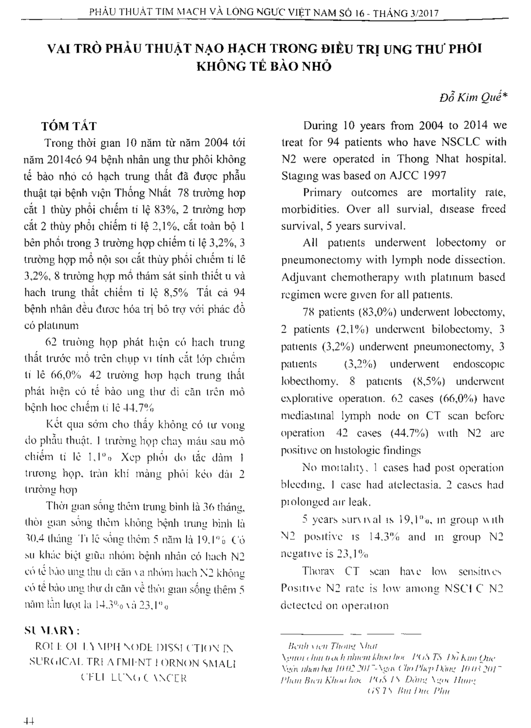 Trong thời gian 10 năm từ năm 2004 tới năm 2014 có 94 bệnh nhân ung thư phổi không tế bào nhỏ có hạch trung thất đã được phẫu thuật tại bệnh viện Thống Nhất. 78 trường hợp cắt 1 thùy phổi chiếm tỉ lệ 83 phần trăm, 2 trường hợp cắt 2 thùy phổi chiếm tỉ lệ 2,1 phần trăm, cắt toàn bộ 1 bên phổi trong 3 trường hợp chiếm tỉ lệ 3,2 phần trăm, 3 trường hợp mổ nội soi cắt thùy phổi chiếm tỉ lệ 3,2 phần trăm, 8 trường hợp mổ thám sát sinh thiết u và hạch trung thất chiếm tỉ lệ 8,5 phần trăm. Tất cả 94 bệnh nhân đều được hóa trị bổ trợ với phác đồ có platinum. 62 trường hợp phát hiện có hạch trung thất trước mô trên chụp vi tính cắt lớp chiếm tỉ lệ 66,0 phần trăm. 42 trường hợp hạch trung thất phát hiện có tế bào ung thư di căn trên mô bệnh học chiếm tỉ lệ 44,7 phần trăm. Kết quả sớm cho thấy không có tử vong do phẫu thuật, 1 trường hợp chảy máu sau mổ chiếm tỉ lệ 1,1 phần trăm. Xẹp phổi do tắc đàm 1 trường hợp, tràn khí màng phổi kéo dài 2 trường hợp. Thời gian sống thêm trung bình là 36 tháng, thời gian sống thêm không bệnh trung bình là 30,4 tháng. Tỉ lệ sống thêm 5 năm là 19,1 phần trăm. Có sự khác biệt giữa nhóm bệnh nhân có hạch N2 có tế bào ung thư di căn và nhóm hạch N2 không có tế bào ung thư di căn về thời gian sống thêm 5 năm lần lượt là 14,3 phần trăm và 23,1 phần trăm.