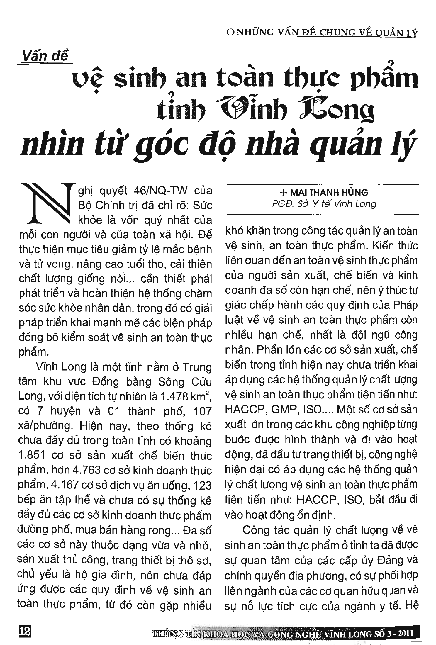 Vấn đề vệ sinh an toàn thực phẩm tỉnh Vĩnh Long nhìn từ góc độ nhà quản lý