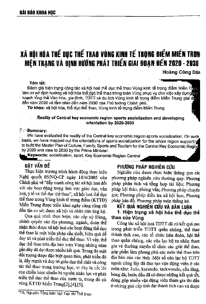 Xã hội hóa thể thao vùng kinh tế trọng điểm miền Trung: hiện trạng và định hướng phát triển giai đoạn đến 2020-2030