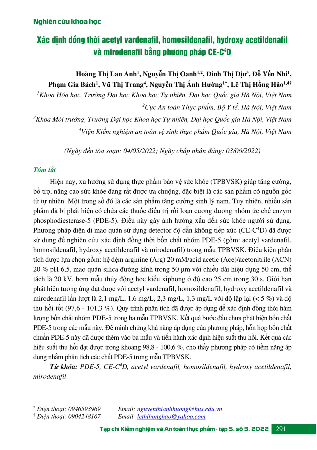 Hiện nay, xu hướng sử dụng thực phẩm bảo vệ sức khỏe (TPBVSK) giúp tăng cường, bổ trợ, nâng cao sức khỏe đang rất được ưa chuộng, đặc biệt là các sản phẩm có nguồn gốc từ tự nhiên. Một trong số đó là các sản phẩm tăng cường sinh lý nam. Tuy nhiên, nhiều sản phẩm đã bị phát hiện có chứa các thuốc điều trị rối loạn cương dương nhóm ức chế enzym phosphodiesterase-5 (PDE-5). Điều này gây ảnh hưởng xấu đến sức khỏe người sử dụng. Phương pháp điện di mao quản sử dụng detector độ dẫn không tiếp xúc (CE-C4D) đã được sử dụng để nghiên cứu xác định đồng thời bốn chất nhóm PDE-5 (gồm: acetyl vardenafil, homosildenafil, hydroxy acetildenafil và mirodenafil) trong mẫu TPBVSK. Điều kiện phân tích được lựa chọn gồm: hệ đệm arginine (Arg) 20 mM/acid acetic (Ace)/acetonitrile (ACN) 20 % pH 6,5, mao quản silica đường kính trong 50 μm với chiều dài hiệu dụng 50 cm, thế tách là 20 kV, bơm mẫu thủy động học kiểu xiphong ở độ cao 25 cm trong 30 s. Giới hạn phát hiện tương ứng đạt được với acetyl vardenafil, homosildenafil, hydroxy acetildenafil và mirodenafil lần lượt là 2,1 mg/L, 1,6 mg/L, 2,3 mg/L, 1,3 mg/L với độ lặp lại (< 5 %) và độ thu hồi tốt (97,6 - 101,3 %). Quy trình phân tích đã được áp dụng để xác định đồng thời hàm lượng bốn chất nhóm PDE-5 trong ba mẫu TPBVSK. Kết quả bước đầu chưa phát hiện bốn chất PDE-5 trong các mẫu này. Để minh chứng khả năng áp dụng của phương pháp, hỗn hợp bốn chất chuẩn PDE-5 này đã được thêm vào ba mẫu và tiến hành xác định hiệu suất thu hồi. Kết quả các hiệu suất thu hồi đạt được trong khoảng 98,8 - 100,6 %, cho thấy phương pháp có tiềm năng áp dụng nhằm phân tích các chất PDE-5 trong mẫu TPBVSK.
