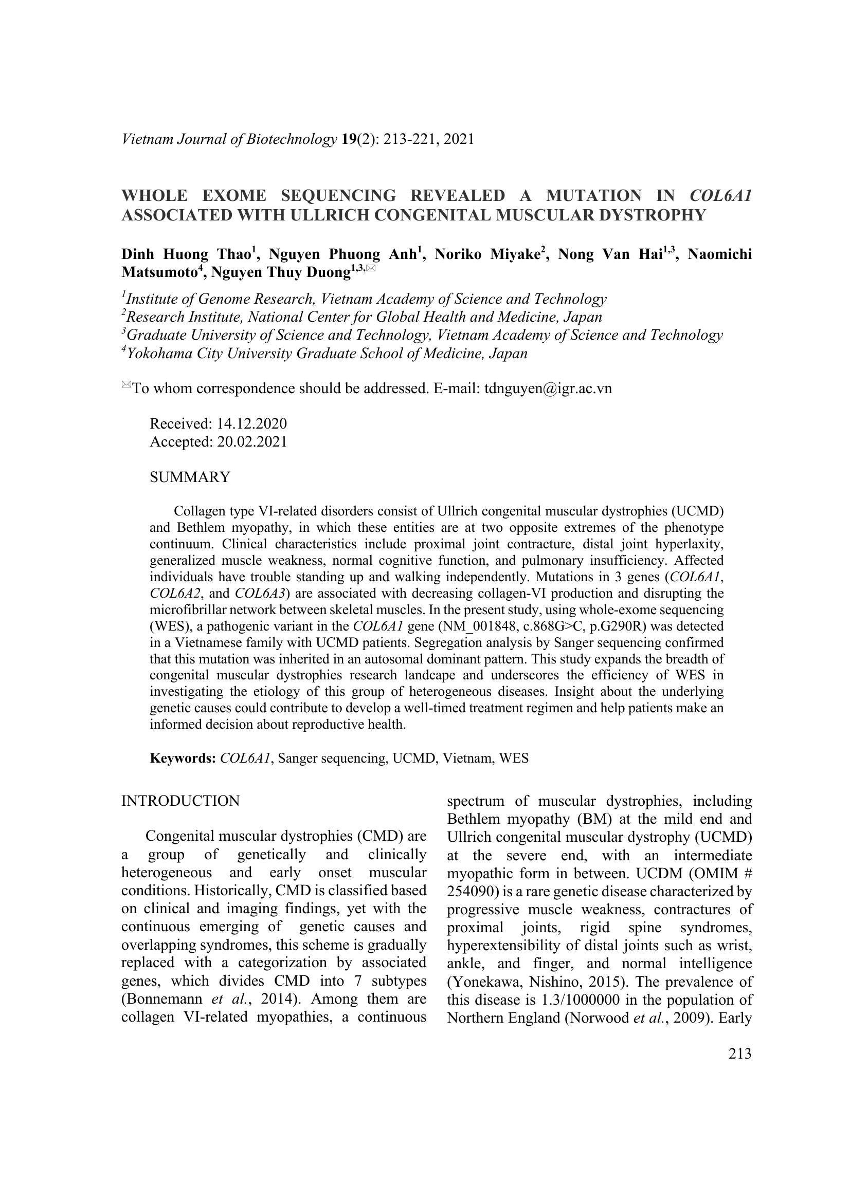 Nhóm bệnh cơ liên quan đến protein collagen loại VI là một dạng loạn dưỡng cơ bẩm sinh gồm một phổ rộng các triệu chứng lâm sàng với mức độ nghiêm trọng khác nhau. Trong đó, bệnh cơ Bethlem là dạng nhẹ còn bệnh loạn dưỡng cơ Ullrich (UCMD) được xếp vào dạng nặng. Người mắc bệnh thường có các biểu hiện như co cứng các khớp gần, các khớp xa linh hoạt bất thường, yếu cơ toàn thân, có các vấn đề liên quan đến chức năng hô hấp và có nhận thức bình thường. Ngoài ra, khó khăn trong việc vận động và tự di chuyển cũng là một dấu hiệu thường gặp. Đột biến ở ba gen COL6A1, COL6A2 và COL6A3 đã được chứng minh là có liên quan đến nhóm loạn dưỡng cơ collagen loại VI. Sử dụng giải trình tự hệ gen mã hoá (Whole exome sequencing - WES), chúng tôi đã tìm ra đột biến gây bệnh trên gen COL6A1 (c.G868C, p.G290R) ở một gia đình người Việt Nam có bệnh nhân mắc UCMD. Kết quả giải trình tự Sanger sequencing trên bệnh nhân và bố mẹ bệnh nhân xác nhận rằng đột biến này được di truyền ở dạng dị hợp trội. Nghiên cứu này góp phần mở rộng hiểu biết về các bệnh loạn dưỡng cơ bẩm sinh, đồng thời nhấn mạnh tính hiệu quả của phương pháp WES trong việc xác định chính xác yếu tố di truyền trong chẩn đoán các bệnh loạn dưỡng cơ. Tìm ra nguyên nhân di truyền gây bệnh góp phần đáng kể vào việc xây dựng phác đồ điều trị lâu dài cho bệnh nhân, từ đó giúp họ có thể đưa ra những quyết định liên quan tới xây dựng cũng như kế hoạch hoá gia đình.