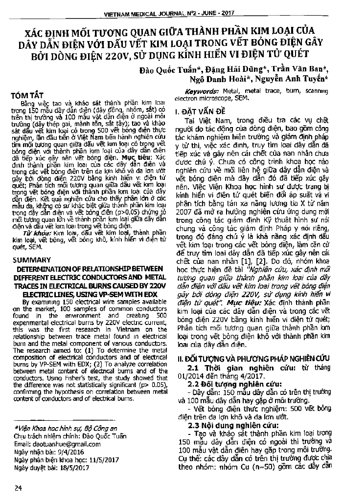 Xác định mối tương quan giữa thành phần kim loại của dây dẫn điện với dấu vết kim loại trong vết bỏng điện gây bởi dòng điện 220V, sử dụng kinh hiển vi điện tử quét. Kết quả cho thấy phần lớn ở các mẫu da, không có sự khác biệt giữa thành phần kim loại trong dây dẫn điện và vết bỏng điện chứng tỏ mối tương quan lớn về thành phần kim loại giữa dây dẫn điện và dấu vết kim loại trong vết bỏng điện.