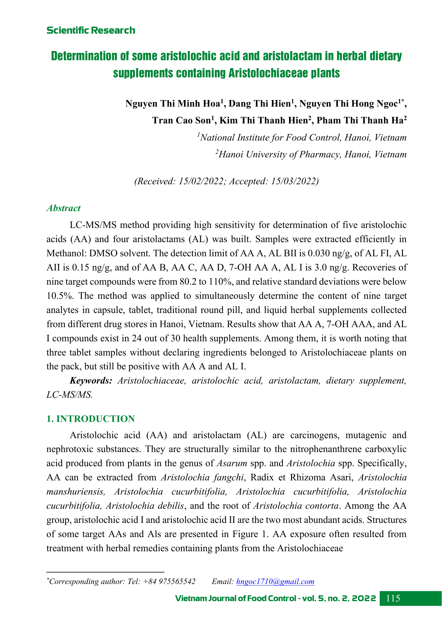 Kỹ thuật sắc ký lỏng khối phổ hai lần (LC-MS/MS) kết hợp với xử lý mẫu bằng hỗn hợp dung môi MeOH: DMSO đã được ứng dụng để nghiên cứu xây dựng và thẩm định phương pháp xác định một số độc tố nhóm aritstolochic acid (AA) và aristolactam (AL) bao gồm: AA A, AA B, AA C, AA D, 7-OH AA A, AL I, AL BII, AL FI, AL AII trong thực phẩm bảo vệ sức khỏe. Phương pháp được thẩm định đạt yêu cầu của AOAC. Giới hạn phát hiện (LOD) của AA A, AL BII là 0,030 ng/g, đối với AL FI, AL AII là 0,15 ng/g, và AA B, AA C, AA D, 7-OH AA A, AL I là 3,0 ng/g. Các chất phân tích có độ thu hồi trong khoảng 80,2 đến 110%, và độ lệch chuẩn tương đối lặp lại dưới 10,5%. Quy trình tối ưu đã được áp dụng để xác định hàm lượng 9 AA và AL trong các mẫu thực phẩm bảo vệ sức khỏe dạng viên nang, viên nén, viên hoàn và dạng lỏng được thu thập từ các hiệu thuốc của thành phố Hà Nội. Kết quả cho thấy AA A, 7-OH AAA, and AL I được phát hiện trong 24 trên 30 thực phẩm bảo vệ sức khoẻ. Trong đó, đáng chú ý là 03 mẫu thực phẩm bảo vệ sức khỏe dạng viên nén không có công bố chứa thực vật họ Mộc Hương (Aristolochiaceae) trên nhãn dương tính với AA A và AL I.