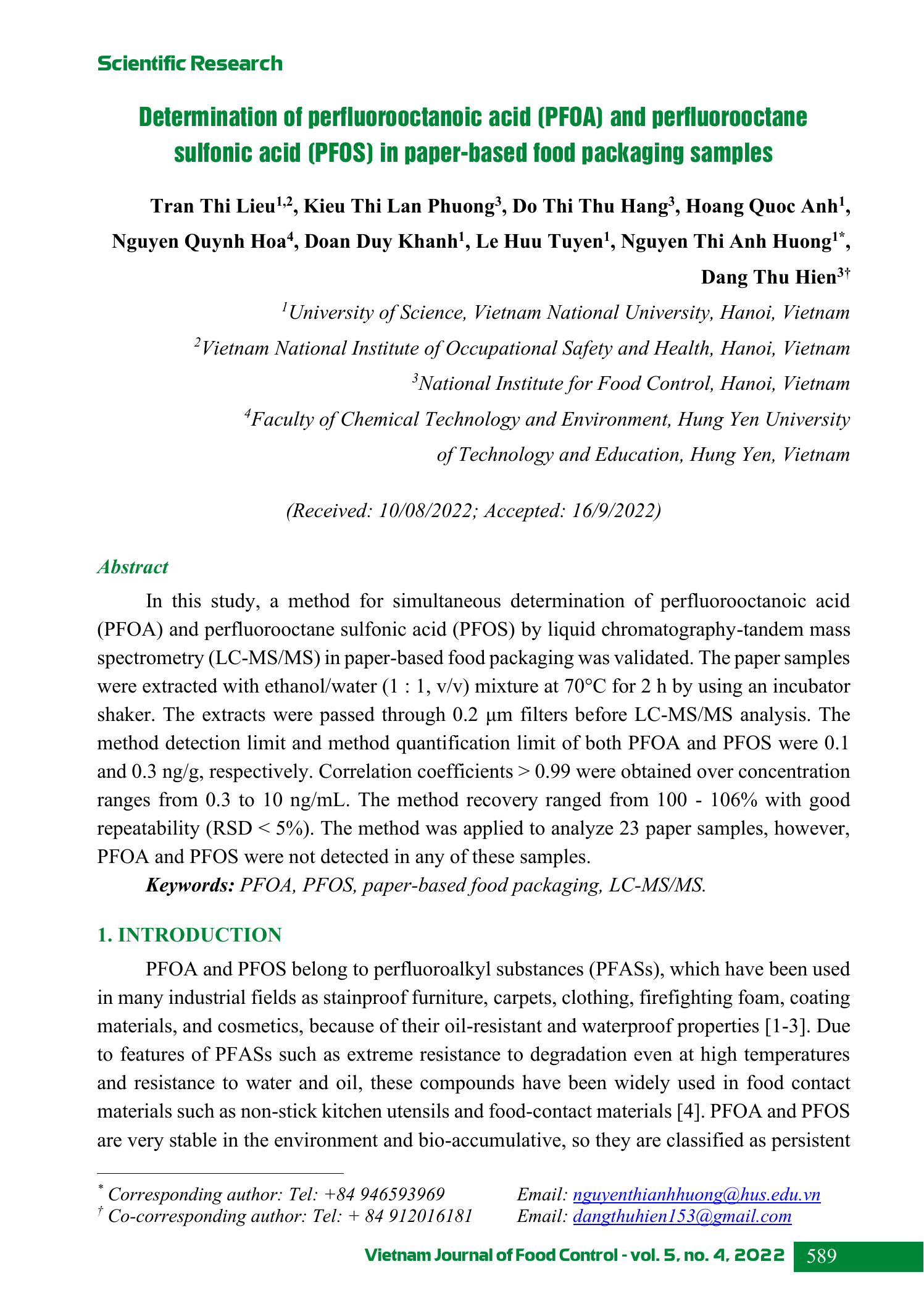 Trong nghiên cứu này, phương pháp phân tích đồng thời perfluorooctanoic acid (PFOA) và perfluorooctane sulfonic acid (PFOS) bằng thiết bị sắc ký lỏng khối phổ hai lần (LC-MS/MS) trong bao bì thực phẩm giấy đã được thẩm định. Các mẫu bao bì giấy được chiết với hỗn hợp ethanol : nước (1 : 1, v/v) ở nhiệt độ 70C trong 2 h. Dịch chiết được lọc qua màng lọc 0,2 μm trước khi phân tích trên thiết bị LC-MS/MS. Giới hạn phát hiện và giới hạn định lượng của phương pháp lần lượt là 0,1 và 0,3 ng/g đối với 2 chất phân tích. Hệ số tương quan tuyến tính đạt R > 0,99 trong khoảng nồng độ 0,3 đến 10 ng/mL. Độ thu hồi của phương pháp dao động trong khoảng từ 100 - 106% với độ lặp lại RSD < 5%. Phương pháp đã được ứng dụng để phân tích 23 mẫu bao bì thực phẩm bằng giấy nhưng không mẫu nào phát hiện thấy PFOS và PFOA.