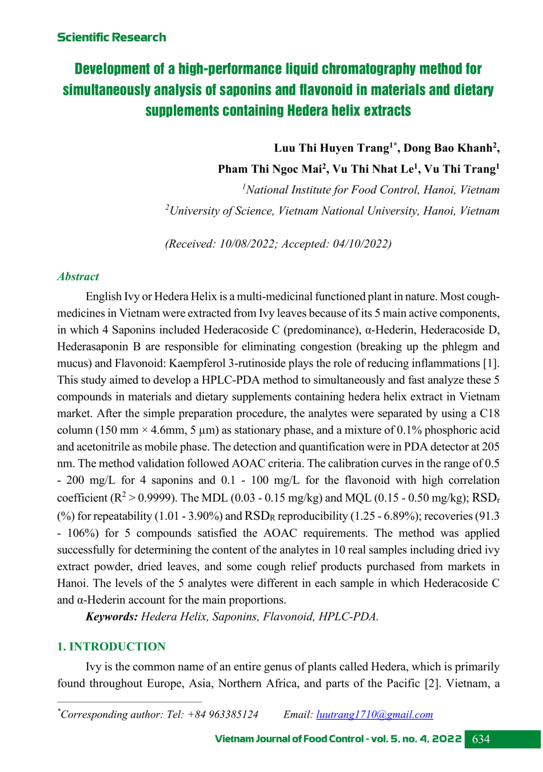 Cây thường xuân (Ivy hay Hedera Helix) là cây có nhiều tác dụng chữa bệnh trong tự nhiên. Hầu hết các loại thuốc ho ở Việt Nam đều chiết xuất từ lá cây thường xuân vì có 5 hoạt chất chính, trong đó 4 chất thuộc nhóm Saponin: Hederacoside C (hoạt chất chính), α- Hederin, Hederacoside D, Hederasaponin B có tác dụng tiêu trừ tắc nghẽn (làm tan đờm và chất nhầy) và 1 chất thuộc nhóm flavonoid: Kaempferol 3-rutinoside giúp giảm viêm. Nghiên cứu được thực hiện với mục tiêu xác định đồng thời 5 hợp chất bằng phương pháp HPLC-PDA trong nguyên liệu và thực phẩm bảo vệ sức khỏe chứa cao khô thường xuân. Các điều kiện HPLC đã được nghiên cứu tối ưu bao gồm: cột C18 (150 mm × 4,6 mm x 5 µm); pha động gồm 0,1% acid orthophosphoric và acetonitril chế độ gradient, bước sóng phát hiện 205nm. Phương pháp đã được thẩm định đạt theo các tiêu chí của AOAC. Đường chuẩn của 5 chất phân tích xây dựng trong khoảng nồng độ 0,5 - 200 mg/L đối với 4 saponin và 0,1 - 100 mg/L đối với flavonoid có hệ số tương quan (R2 > 0,999); MDL (0,03 - 0,15 mg/kg) và MQL (0,15 - 0,50 mg/kg); RSDr cho độ lặp lại (1,01 - 3,90%) và RSDR độ tái lập (1,25 - 6,89%); độ thu hồi (91,3 - 106%). Qui trình phân tích đã được áp dụng để phân tích 10 mẫu bao gồm cao thường xuân khô, lá thường xuân khô và một số mẫu thực phẩm bảo vệ sức khỏe có chứa cao khô thường xuân tại Hà Nội. Hàm lượng chất phân tích có sự khác nhau giữa các mẫu, trong đó Hederacoside C và α-Hederin chiếm tỷ lệ chính.